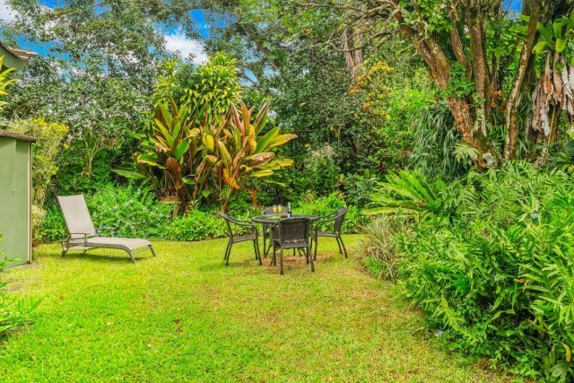 This charming 2 bedroom Princeville cottage harkens the senses to a bygone Hawaiian era. Tastefully decorated and beautiful lush landscaping with mature flowering trees add to this fabulous corner lot in a small quiet cul de sac. Relax in the screened in sun room or get to work in the separate office area while taking in lush gardens outside. When its time to wind down, step out into the gardens for a soak in the separate hot tub off the primary bedroom. This home is very private.Perfect for a home or vacation rental.Currently an active vacation rental - showings are based on avalabilty between guest stays.