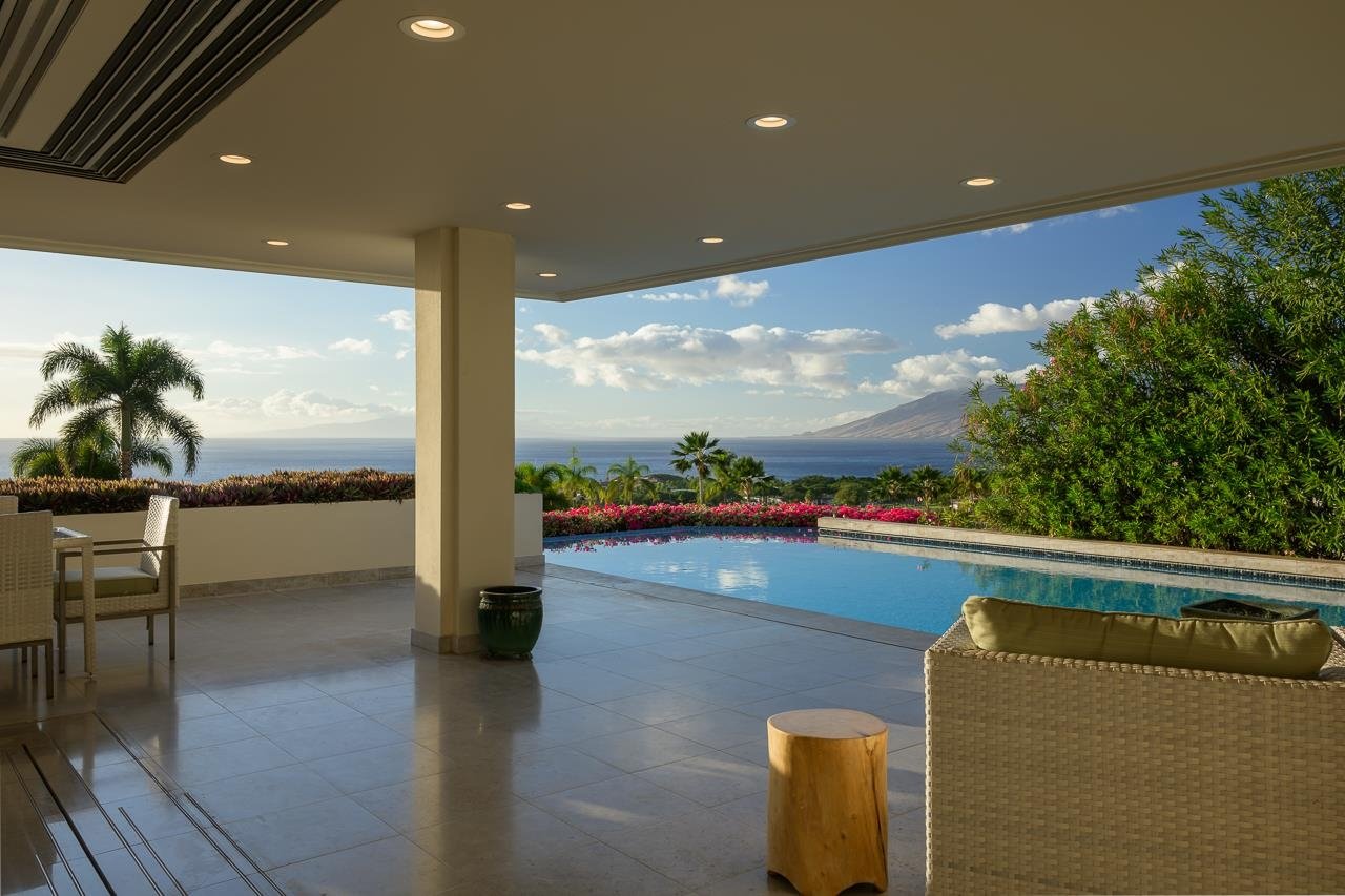 Elegance flourishes in this lushly landscaped 4,588 sq. ft. 4 bedroom, 3.5 bath, (office currently used as 4th bedroom) residence, gracefully positioned near the pinnacle of Wailea Golf Estates—Wailea’s premier gated enclave. Renovated in 2017, this home captures mesmerizing year-round ocean, outer island, and sunset views, stretching from Molokini Crater to Lana‘i, Ma‘alaea Bay, and the West Maui Mountains. As twilight falls, the night sky enhances this exquisite setting with a touch of magic.Two sculpted hand-carved birds adorn the white-on-white French entry doors, offering a warm and artistic welcome. Inside, the light-filled central living area exudes sophistication, with elegant travertine floors extending through the living, dining, and kitchen spaces. Retractable sliding glass walls dissolve boundaries, seamlessly connecting a 2,126 sq. ft. lanai with panoramic ocean views. The lanai features an infinity pool, spa tub, and outdoor bar—ideal for entertaining or enjoying tranquil Maui horizons.The chef’s kitchen boasts specimen granite counters, a full-height backsplash, LED under-cabinet lighting, a Wolf double oven, and a Sub-Zero fridge. A disappearing sliding glass window connects the kitchen to the poolside wet bar, blending functionality with island luxury. Behind the kitchen, a spacious pantry features a full-size wine fridge and additional storage. An oversized contemporary glass elevator and a bamboo wood staircase with custom copper-and-brass handrails provide access to all levels. The primary bedroom suite offers sweeping ocean views, a spa-like en-suite bathroom, and a spacious walk-in dressing area. Additional guest suites provide luxurious accommodations, including one with private access, a full wet bar, and eat-in counter space. An owned 40-panel PV solar electric system, 4 zone central AC system and an oversized garage further enhance this extraordinary home’s appeal. Surrounded by Wailea’s pristine weather, world-class beaches, dining, and golf courses, this iconic residence embodies the ultimate indoor-outdoor Maui lifestyle.