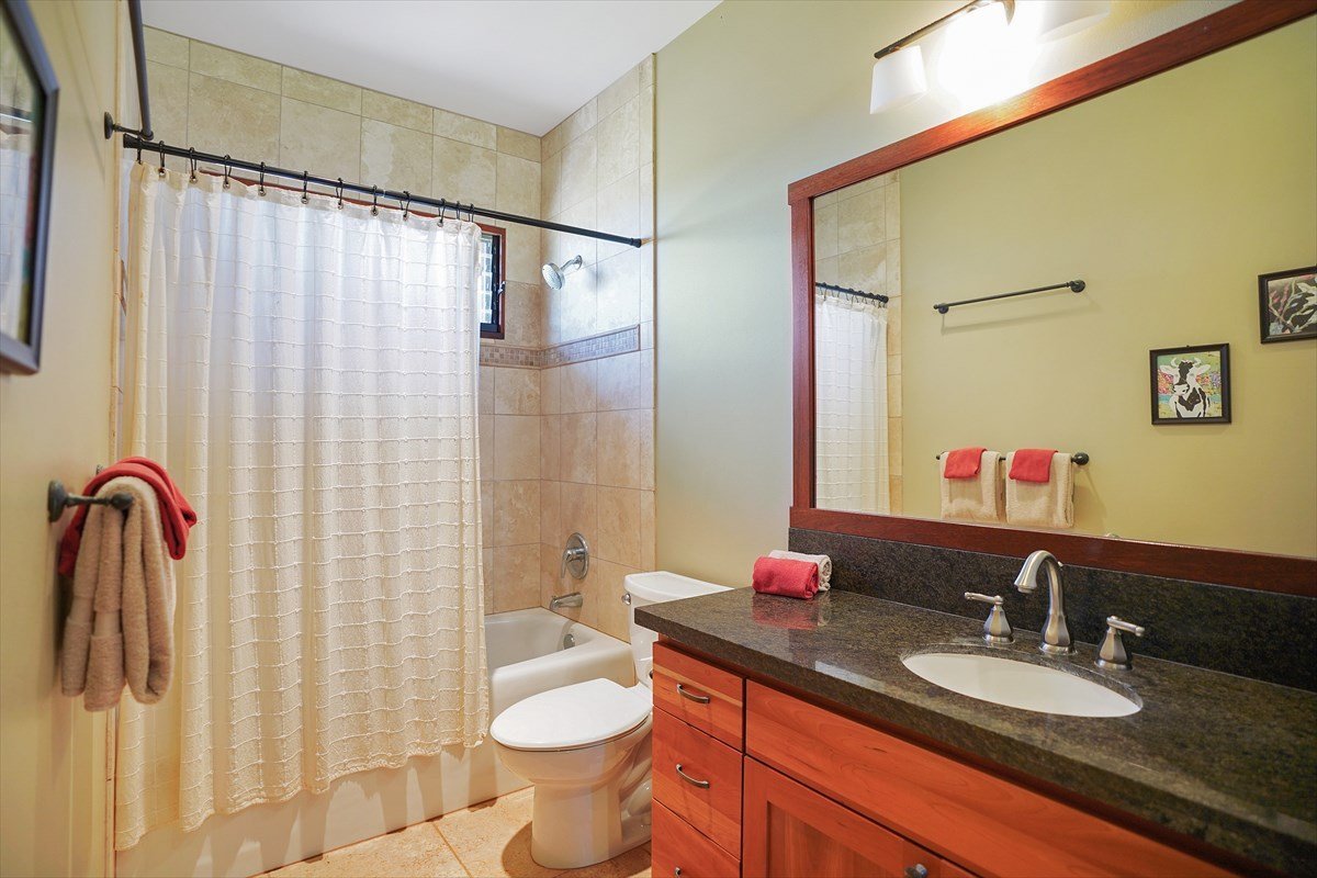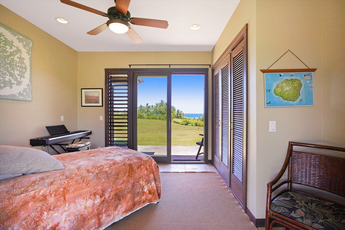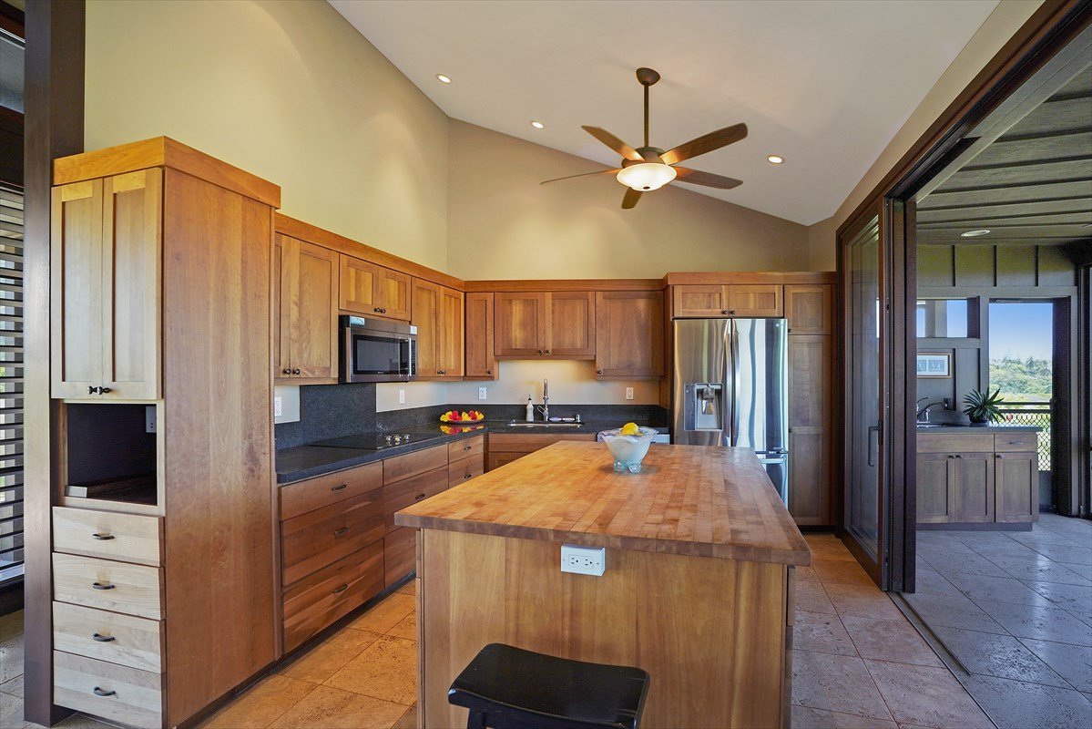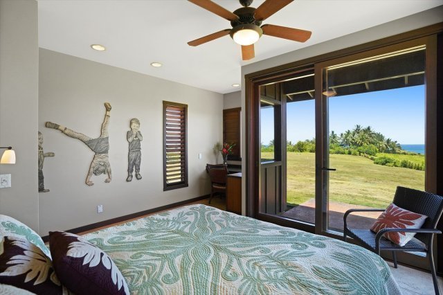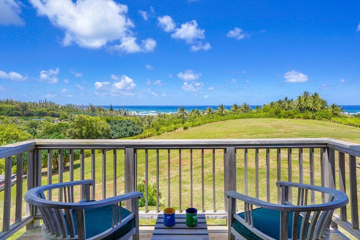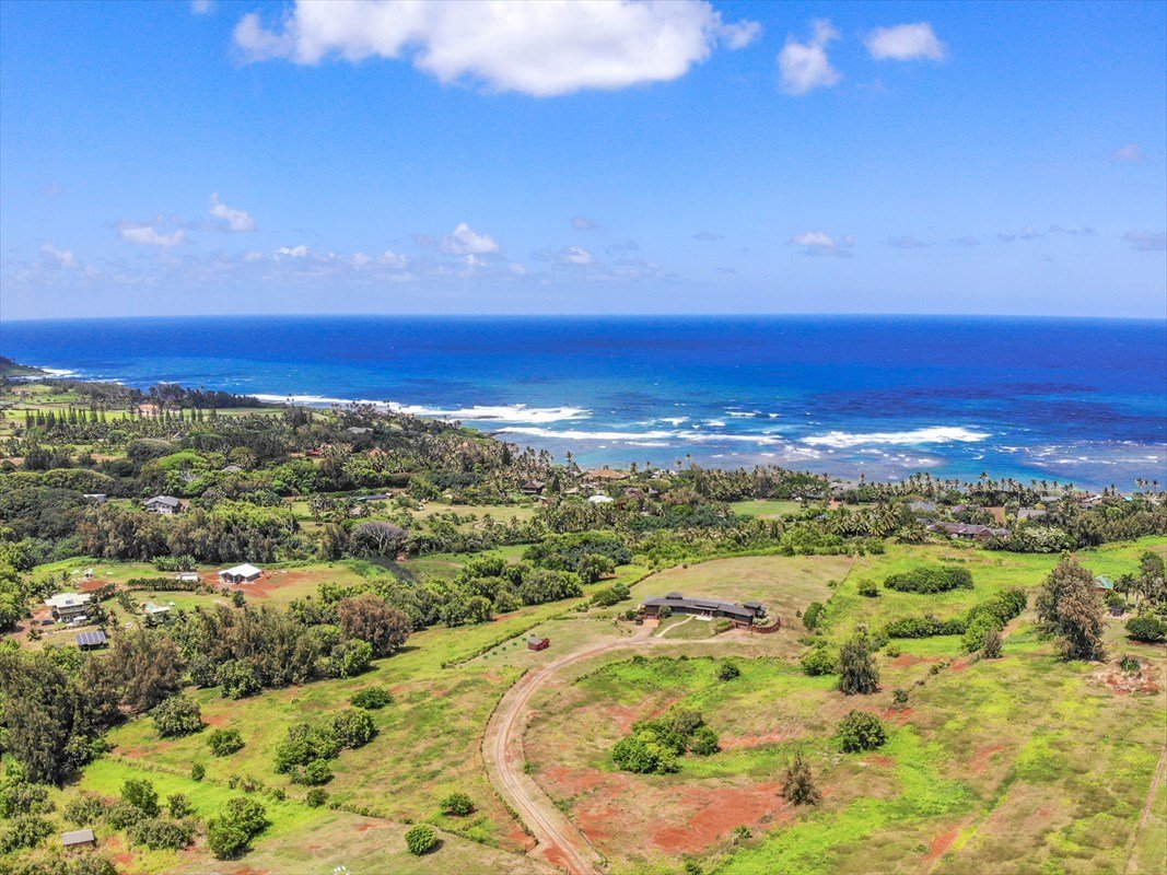 Approach this beautiful and unique home down a long country driveway and appreciate the long silhouette of the house carefully sited on the green bluff with a view of Aliomanu Bay as backdrop. You can hear the surf and feel the breeze as you look toward the ocean on one side or iconic Kalalea mountain on the other. Every room of the house has views in both directions, to see sunrise over the ocean and sunset behind the mountain. At night the stars are brilliant. The property includes two fenced paddocks, one 5 acres and the other 7. Next to the house on the ocean side, the owners have created a haven for Laysan albatross, wide-winged soaring birds who occasionally glide over the house and out to sea. An albatross hatched here for the first time in 2020, after careful habitat protection to welcome these gentle birds. Birdsong is always in the air. And you may see a Hawaiian owl (pueo), or ruddy turnstones (akekeke), nene geese, plover (kolea), and distant soaring frigate birds. The home was designed for use by two families. Each end of the home has bedrooms, seating areas, office, decks, and seclusion. Shared areas include the living room, dining area, kitchen and long, screened lanai. Hardiboard exterior, ipe decks resist Kauai's sun, rain and wind. Sarana windows and doors are trimmed in a sustainably-farmed tropical hardwood, merbau. Cherry wood cabinets throughout. Limestone tile floors, granite counter tops. Master Bath Japanese furo soaking tub. Ceiling fans and carefully planned ventilation throughout the home. A private well-water system provides excellent drinking water with ample flow to water for your farm or gardening pursuits.