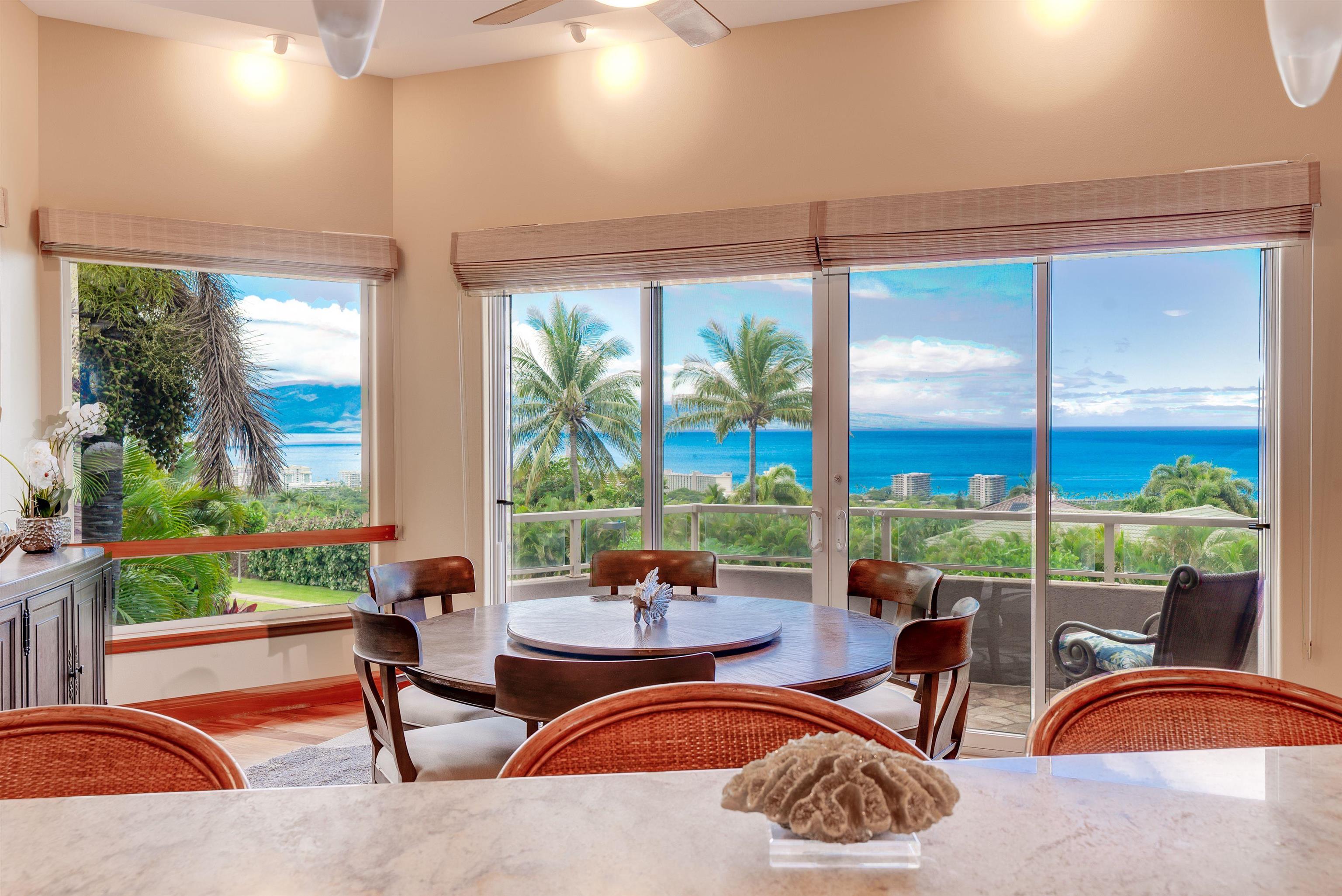 Are you looking for spectactular turquoise ocean and rare double island views? Then you have found your place in Paradise! Be mesmerized the moment you enter the doorway by breathtaking views of the sparkling aqua-blue seas, enhanced by the rare find of views of both Lana'i and Moloka'i, providing you with year round brilliant orange, magenta and golden-flecked sunset views.Be enchanted in the spendor of whales leaping and frollicking during whale season to your delight,and by dramatic moonlight lighting up the ocean into shimmering diamonds at night.190 degree plus ocean views.Stunning Brazillian hardwood flooring,beautifully remodeled kitchen with granite countertops, stainless steel appliances. Offering whole-home stereo system and 3 zones of AC for your comfort and convenience,and a fully owned photovoltaic 51 panel system with 3 new top flight Tesla power batteries.Enjoy the privacy afforded by an end of cul-de-sac peaceful location within the front row of the prestigeous private gated community of the Summit,within Ka'anapali Golf Estates. Live life to the fullest extent being in a golf cart and walking friendly community.Walk or cart quickly down to the sparkling sandy beaches,great surfing areas,golf galore,and the 3 mile beach pathway taking you to the finest dining experiences,shopping,and enjoyment.New electronic shades, and an actual laundry room.Reach out for additional features.Master Suite boasts magnificent expansive ocean views, and rivals any five star hotel with jacuzzi tub,double sinks,large shower with multiple heads,and a large walk-in closet complete with wooden builtins and dressers for your every need.Guest Master features complete privacy, with en'suite double sink and large walk in shower. 4 Ensuite Bedrooms. Lush tropical landscaping surrounds your home, with a completely private and protected work out sized pool, and Jacuzzi, heated for your year round enjoyment, featuring stunning ocean and island views. An exquisitely delightful poolside area is provided for lounging and sunning in opulance, and an expansive covered lanai nearby for reading and relaxing. A full poolside restroom and private outdoor shower enhance your luxurious experience. Make this your home, or your home away from home!