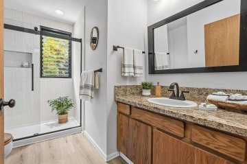 Inside, the kitchen boasts ample cabinet and counter space, with a laundry room conveniently located nearby. Flowing seamlessly into the living room and beyond, the home retains its original hardwood floors in excellent condition, complemented by custom Shoji doors and other unique architectural details. This level also includes 2 bedrooms and a full bath, In addition to the primary suite and bath thoughtfully tucked away in one corner for added privacy.