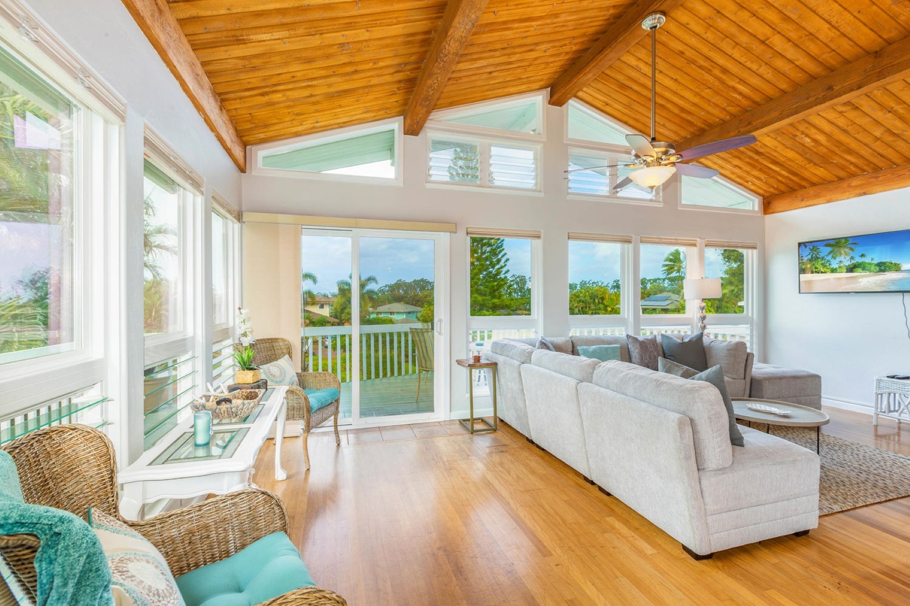 Welcome to 4123 Rooke Pl, a charming 3 bedroom, 2 bath home located on a quiet cul-de-sac in Princeville. This lovely home features hardwood floors and an open concept living space, with expansive windows that invite natural light. Spacious upper deck to enjoy the mountain views and cool trade wind breezes. A peaceful and private backyard to experience Kauai's outdoor living!Upstairs you will find an open living room, dining and kitchen plus an oversized primary suite with ensuite bath. Downstairs there are 2 additional guest rooms and a guest bath, plus a spacious laundry room.Located just minutes from world class golf, pristine beaches, and hiking trails. Walking distance to shopping and restaurants, this home is ideal for those seeking the ultimate Hawaiian lifestyle. Whether you are looking for a primary home or an investment property, 4123 Rooke Place offers unmatched serenity in one of Kauai's most desirable communities. Accepting Back-up offers!