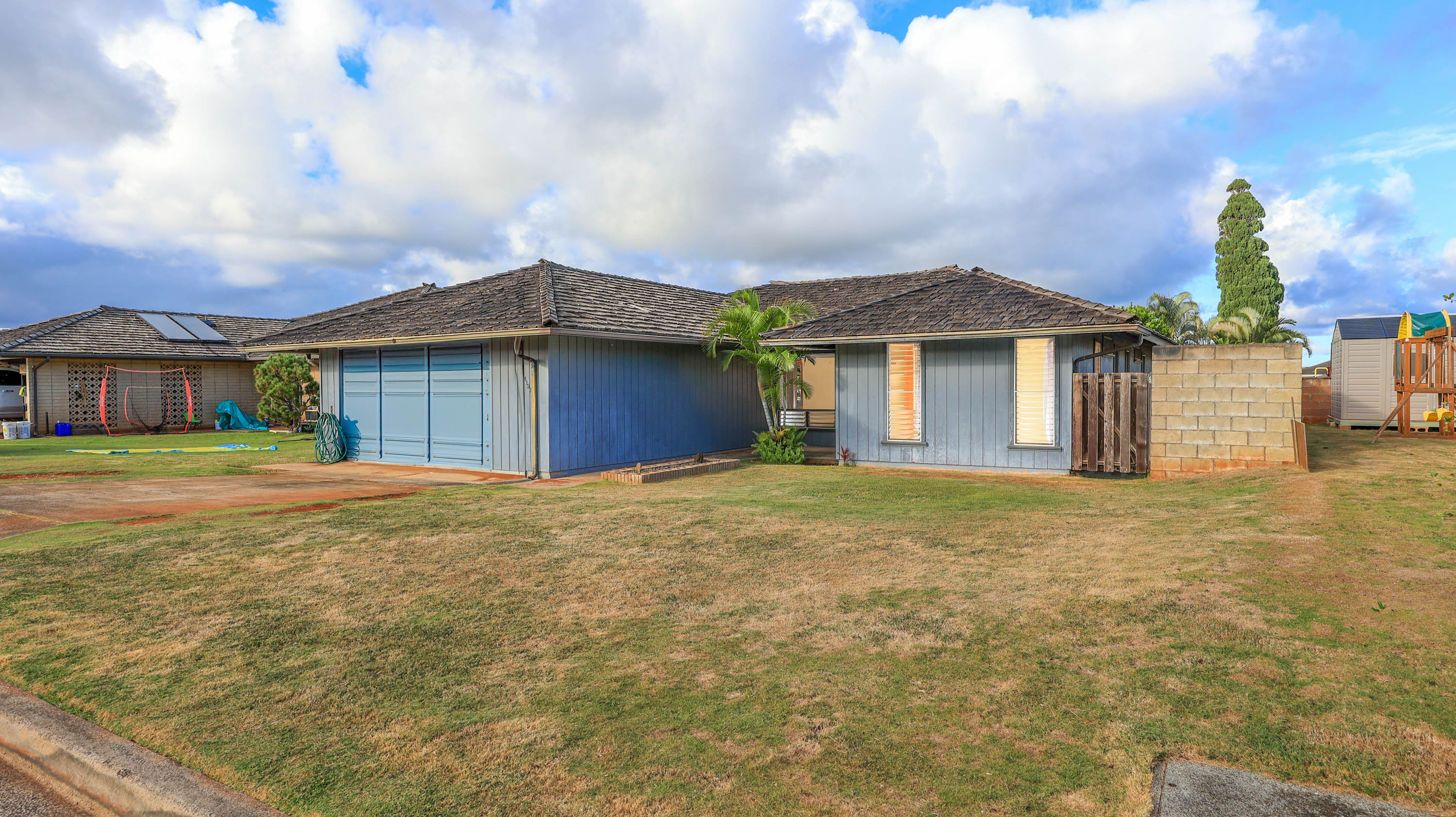 You can't beat the location of this single-level 3 bedroom, 2 bath home in Ulu Mahi Subdivision near golf course, shopping mall and major retailing. The open floorplan design melds kitchen, dining and living spaces into one great room. Skylights and oversized windows bring in the natural light and the high cathedral ceilings give the home a spacious open feel. The concrete patio area opens up to the private enclosed back yard.