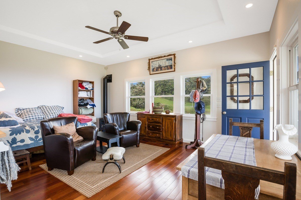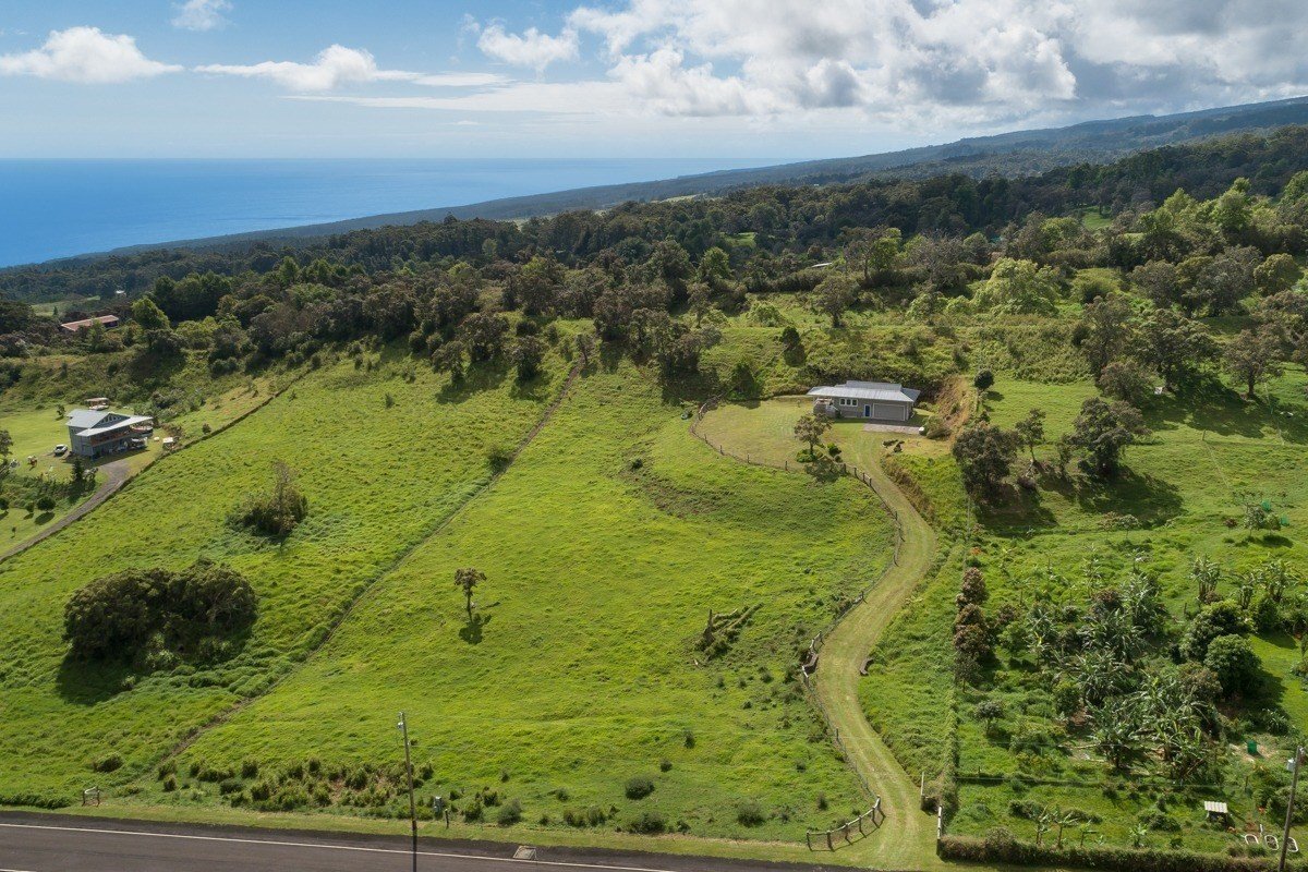 Architecturally designed plantation style cottage in cool upcountry Paauilo with ocean views on 5 fully fenced acres. Cattle are being raised on most of the 5 acres, and the house and driveway are fenced to keep the cattle out. Access is via a private road with security gate. There is a large graded building pad in front of the cottage for easy building of an addition when you are ready to expand. The cottage boasts cathedral ceilings, engineered hardwood floors, quality Marvin double-hung windows, with recessed and dimmable lighting. Fully functional kitchenette with stove, sink, refrigerator and charming kitchen farm light fixtures. There is a Jotel gas stove in the living area that provides instant heating on chilly nights. For those warm days there is a 52” ceiling fan. Rinnai on demand gas water heater for hot water demands. Keawe post fencing frames the gentle S-surve driveway which has rock walls surrounding the culvert. There is a wide ocean view from the lanai, with Trex composite decking and comfortable wide topped railings for additional seating. The large 572 square foot attached garage with high ceilings and an automatic garage door provides for extra security for autos and storage requirements. Landscaping includes young ohia trees, and newly planted koa and jacaranda trees. This property is only 15 minutes to Honoka’a and 30 minutes to Waimea. Utilities include two 4,000 gallon water tanks (8,000 gallons total, while the existing pad can accommodate a third 4,000 gallon tank) with pump and water filter system; and an existing underground electricity conduit from the roadway to the house also ready for land line telephone/cables.