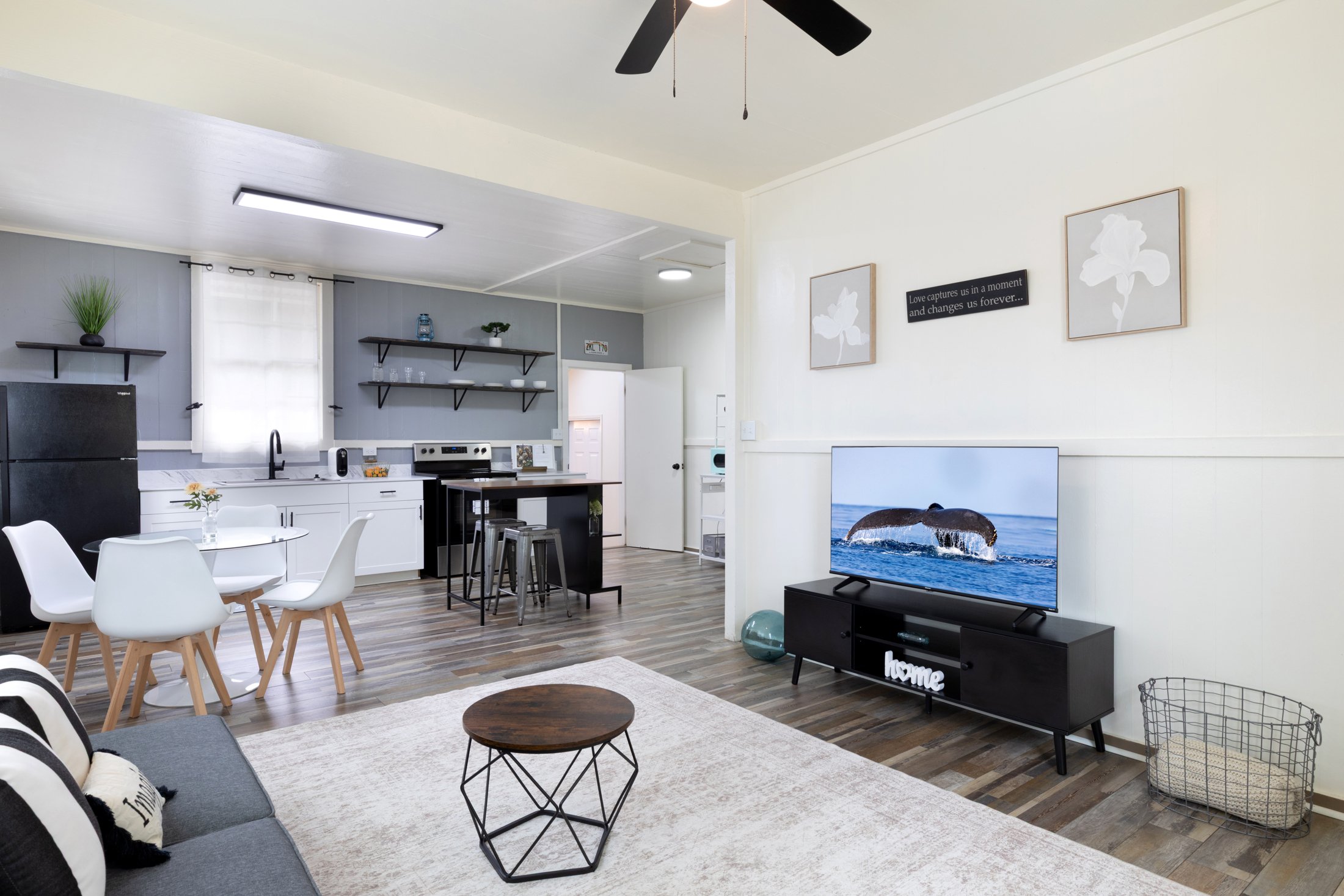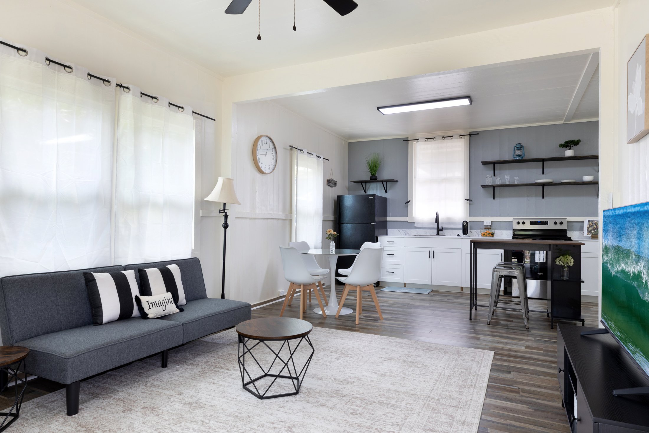 Recent improvements include fresh interior and exterior paint, new 12mil water-resistant LVP flooring throughout, and 20mil luxury vinyl tile in the bathroom. The kitchen boasts brand-new cabinets, countertops, floating shelves, a new sink and faucet. Additional upgrades include all-new LED light fixtures, ceiling fans, 11 new vinyl windows, a repaired foundation and subfloor, and an upgraded bathroom with new plumbing, a shower/tub insert, a vanity, and a pocket door for added privacy. A new Rinnai on-demand gas tankless water heater, updated gas plumbing, and a Gas Co. tank enhance efficiency. The property also features a new concrete driveway, refreshed landscaping, and added gravel and grass for a clean, manicured look.