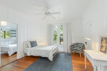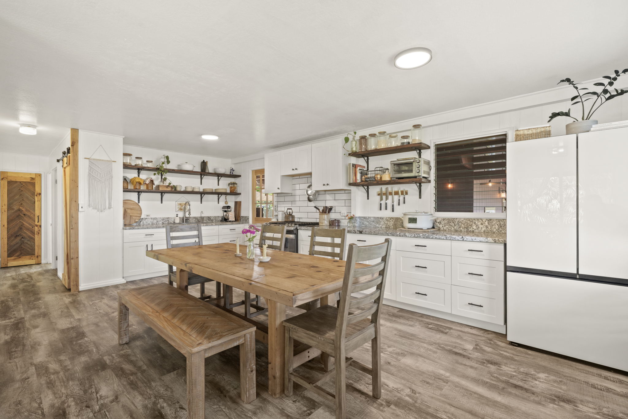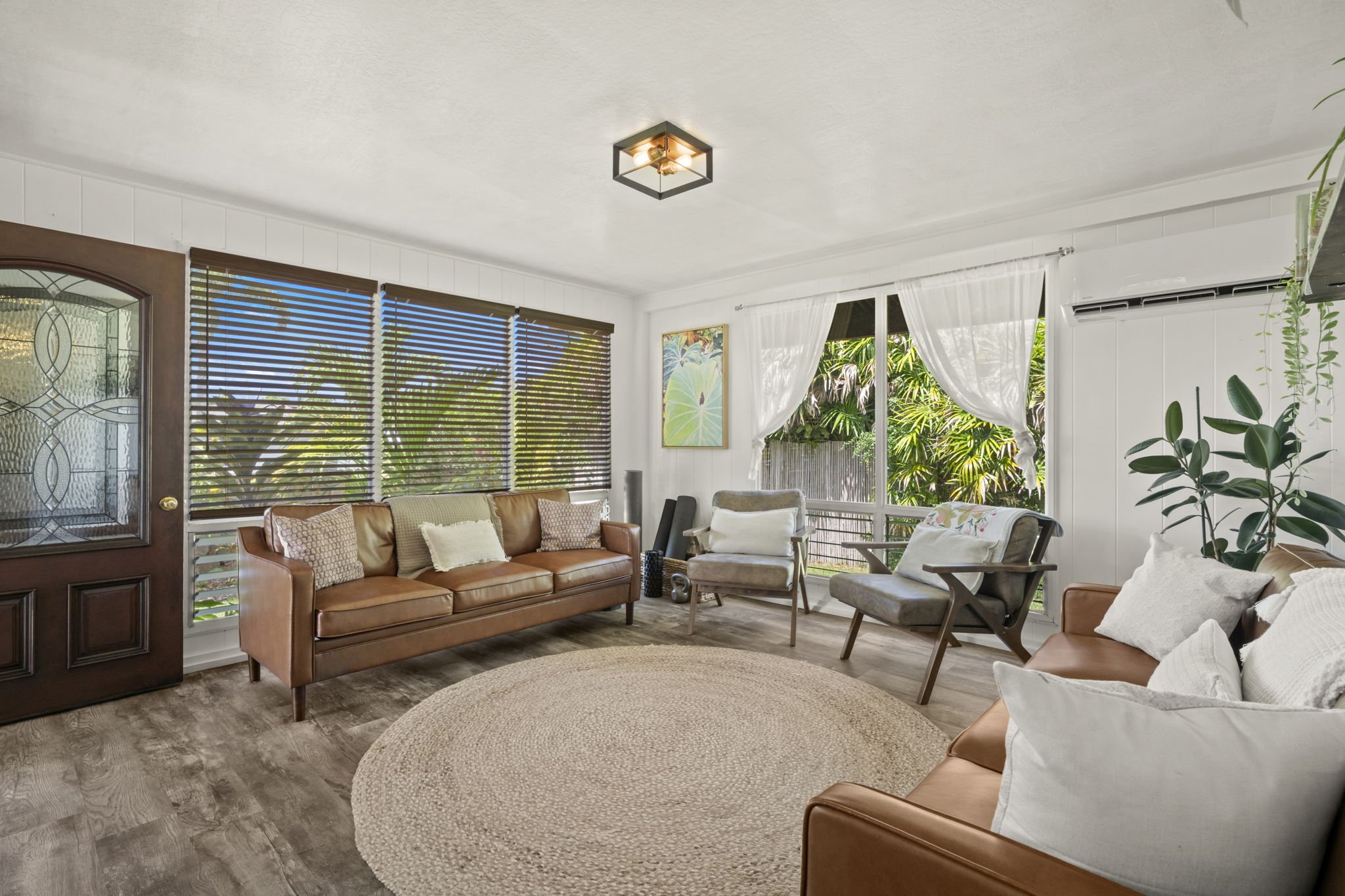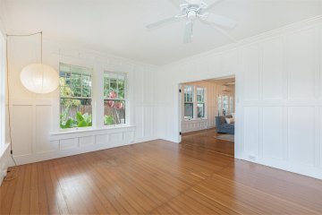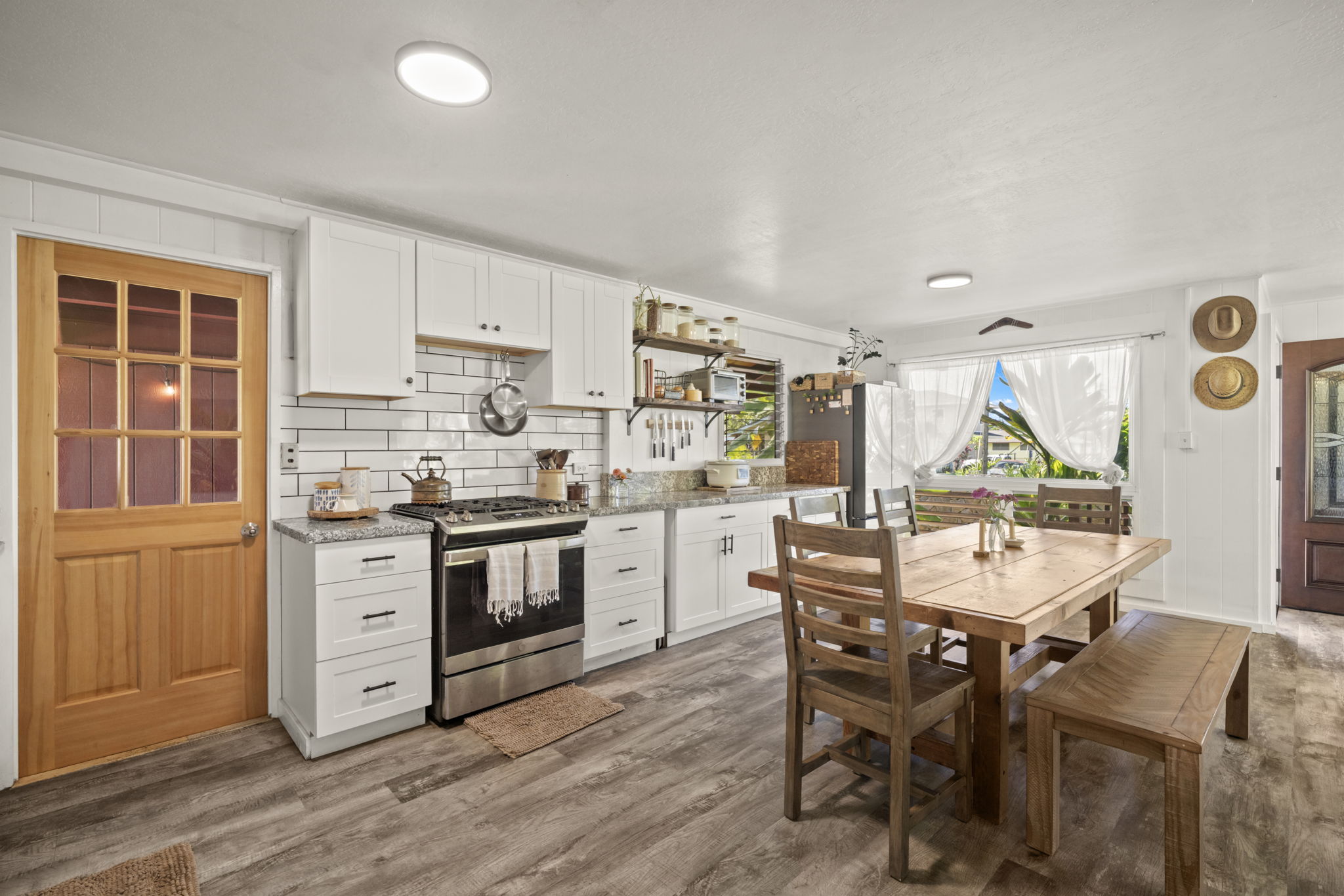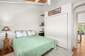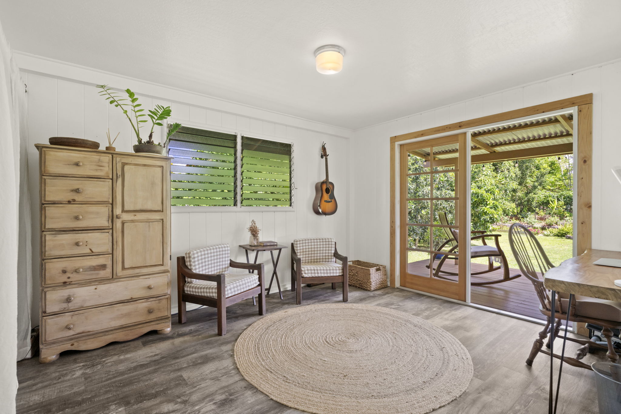 A classic, well-maintained, redwood home with an ideal location in the heart of Kilauea. Fronting the property is a lava rock wall offering privacy with a Hawaiian touch. Inside you’ll feel welcomed by the comfortably updated, breezy open floor plan that’s full of natural light. Updates from 2016-present include new flooring, fresh interior & exterior paint, a completely renovated bathroom, and a new roof over the studio. All new cabinets, granite counters, and appliances in the remodeled kitchen. A split AC unit and on demand hot water heater have been installed. The home's open layout allows one bedroom to effortlessly serve as additional living space offering a tranquil escape with French doors that lead out to a large, covered deck overlooking the garden, blending indoor and outdoor living. A separate ohana unit, currently in use as a pottery studio, may easily be used as an additional bedroom, a private retreat for guests, or a potential rental. There's an outside shower. A convenient laundry area is tucked away in the back of the home allowing easy access from both the main house and studio. The backyard is spacious, fully fenced, and beautifully landscaped with Brazilian cherry, dragon fruit, mulberry, guava, avocado, banana, macadamia nut, lychee, limes, orange, grapefruit, pineapple, papaya, bread fruit, and more. A vegetable garden and a small chicken coop add to the property's unique island charm. Enjoy the ultimate convenience of being able to walk to everything! The home is steps away from a variety of shopping options, restaurants, the market, a gym, medical facilities, the Kauai Bus stop and more. It's also within walking distance of Kilauea Elementary, Kauai C. Academy, and the future Namahana School. The Kilauea Lighthouse is 1.5 miles away. A short drive to some of Kauai’s most beautiful beaches. Plans for a second dwelling/ADU and septic system are attached to the MLS.