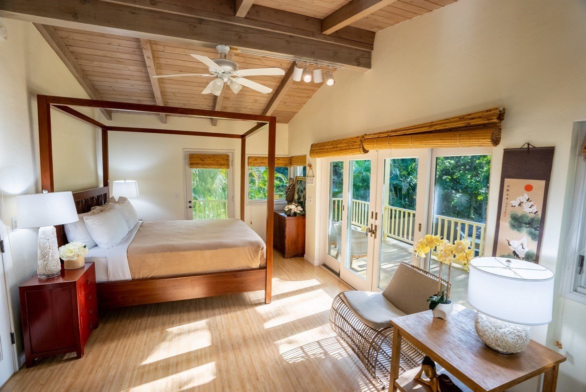 The home has been recently upgraded and fully furnished throughout. This spacious home includes a full kitchen complete with stove, oven, refrigerator, Koa wood cabinets, dishwasher and microwave. Bedrooms are comfortably furnished with beautiful new crisp linens, pillows and bed coverings. The spaceous home is also air conditioned throughout. Nani Kai is the perfect place for a family or other small group. The large back yard with gazebo and gas BBQ is a great place for hanging out and enjoying the great weather and beautiful mountain & waterfall views along with the privacy of lush tropical gardens. There is a custom outdoor ipe shower to wash off the sand from the Beach. While you and/or your guests are enjoying your home you can take a stroll to the farmer’s markets throughout the week, coffee cafes, fresh fish markets and sushi bars. Visit Hanalei Pier, Lumahai, Tunnels, Ke'e Beach, Na Pali Coast and some of the most beautiful beaches in the world! This Vacation Rental home/property is an ideal spot for family, friends and visitors looking to enjoy Hanalei Bay on the North Shore of Kaua'