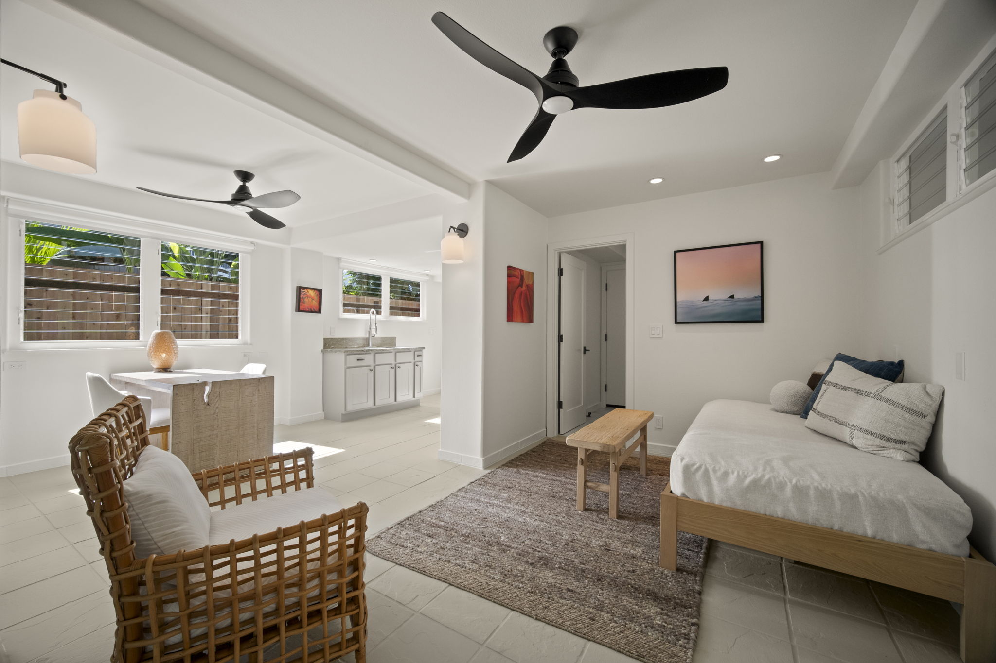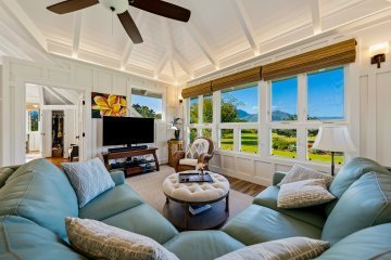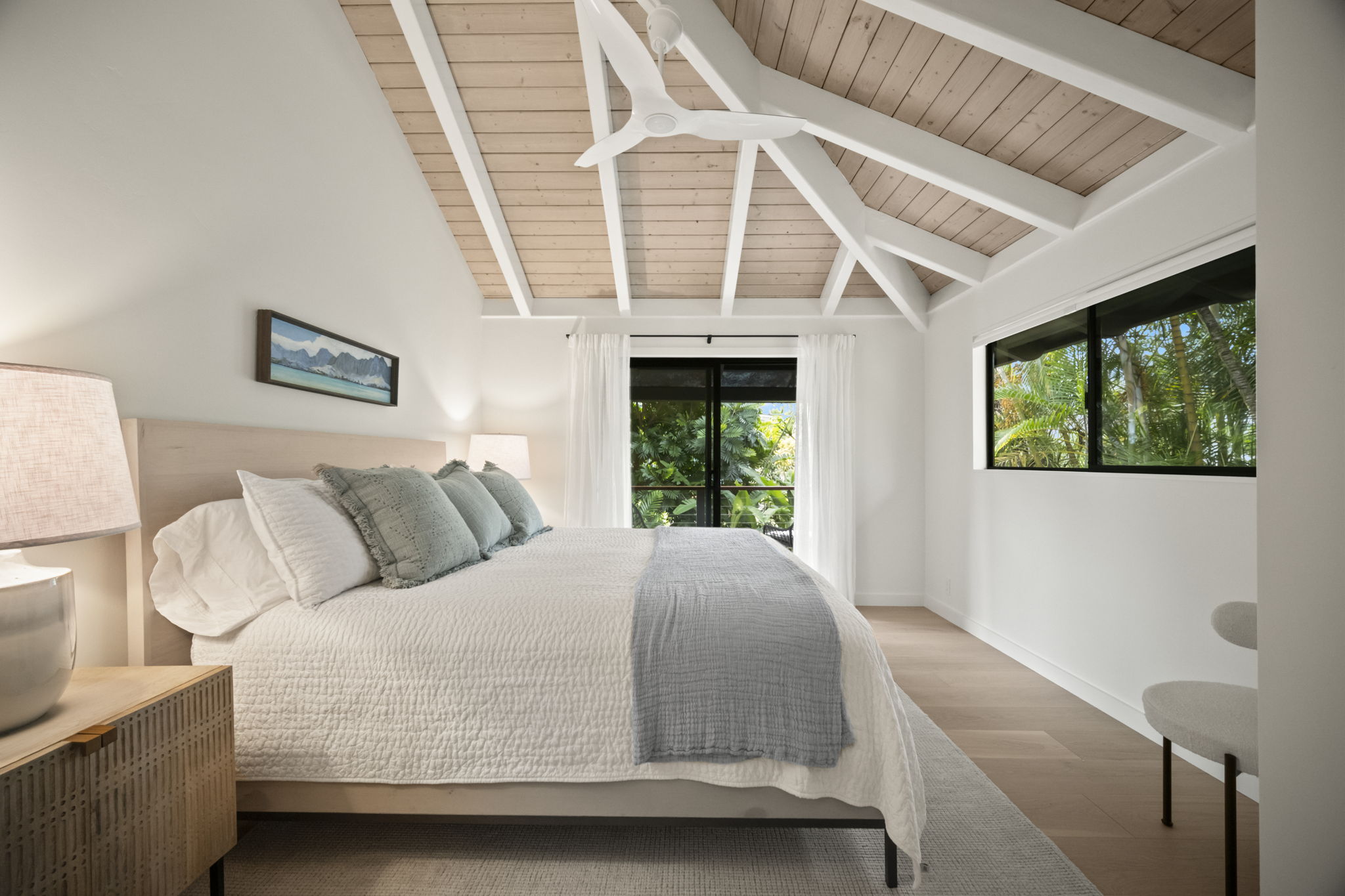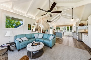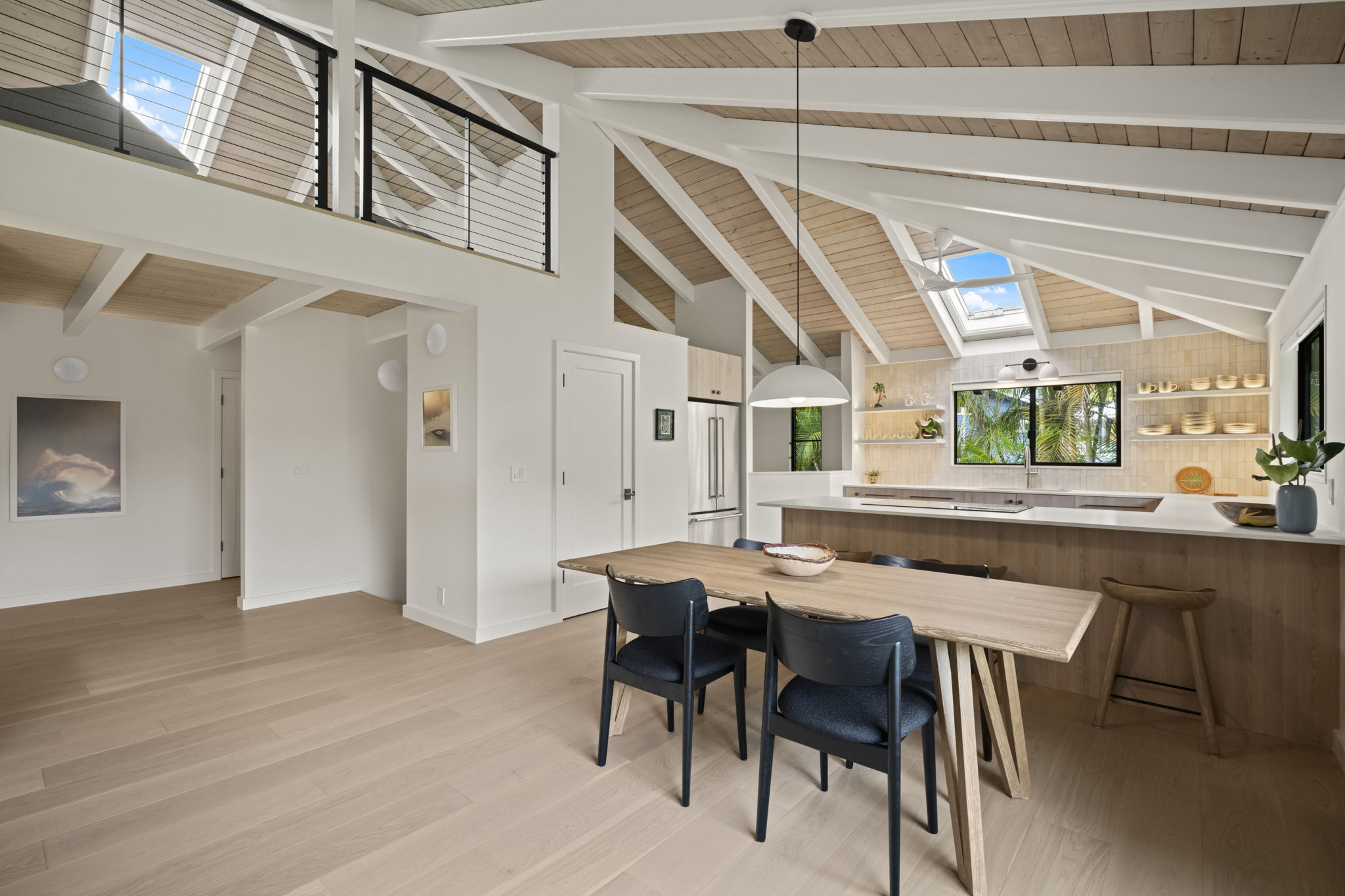 Nestled in Hanalei Palms, one of the most sought-after neighborhoods in Hanalei, this recently renovated home blends modern coastal design with the relaxed charms of island living.A collaborative effort by Gia Design and Rocky Mountain Hardware, the home presents a "Modern Meets Beach" aesthetic. Clean lines, natural textures, and an airy, light-filled palette are all found just one block from the world-famous Hanalei Bay.The main residence features 2 bedrooms and 2 bathrooms, plus a finished loft, perfect as an office, yoga nook, or kids’ play space. The inviting kitchen, dining, and living area flows seamlessly to a covered lanai, overlooking a lush back yard that backs up to a serene tropical jungle. Off the ground level, a spacious bonus room with a private entrance offers flexibility for a variety of uses. The property is full of nature landscaping providing a sense of privacy and peace.Situated on a quiet street just across from the bay, this turnkey property is only a short stroll from the heart of Hanalei town—where you will find restaurants, coffee shops, shopping, galleries, grocery stores, and farmers market. The beach serves as a gathering place where neighbors come together for daily bay walks, surfing, swimming, all set against stunning mountain views.Whether you're seeking a primary residence, vacation retreat, or investment opportunity, this Hanalei Palms oasis is ready to welcome you. Just bring your surfboard and suitcase; Hanalei living starts here.