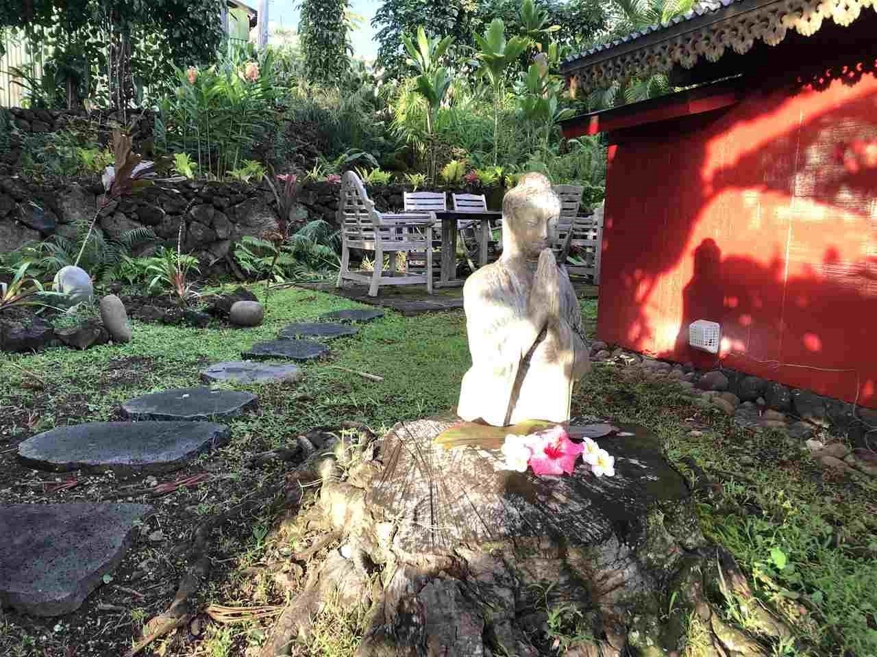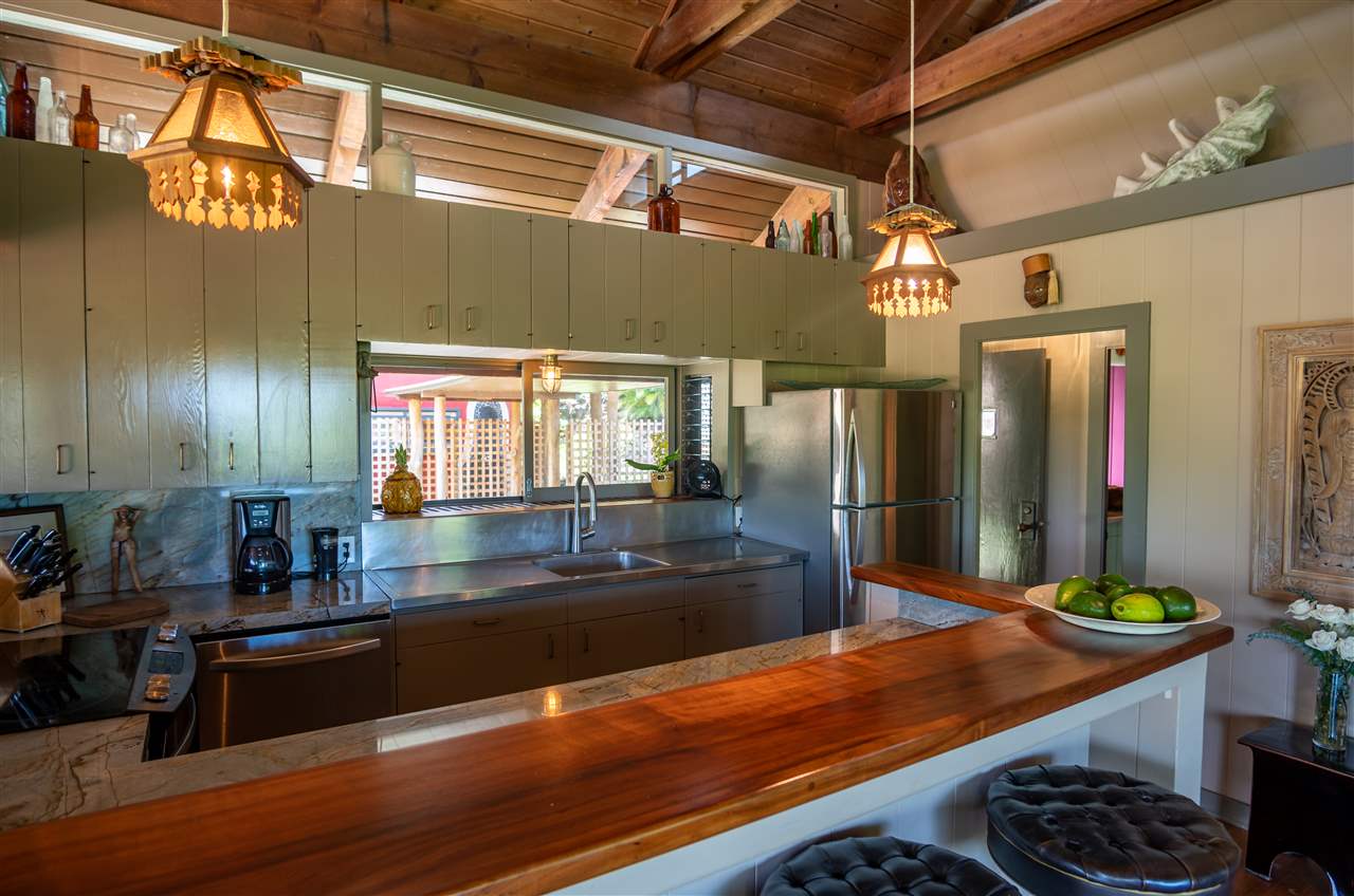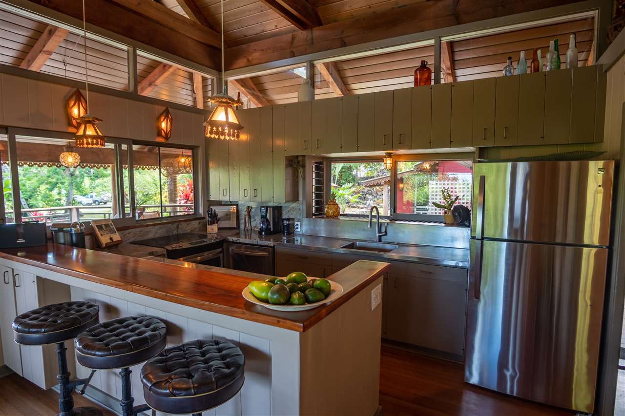 Hale Ilima is named for the native Hawaiian ilima blossoms that abound on this one acre beautifully landscaped property. Like the ilima lei, woven with hundreds of flowers and once reserved for Hawaiian royalty, this property has hundreds of meticulous details woven together to create a stunning retreat. The owners have created a fusion of Hawaiian tropical style with exotic accents from around the world. Perched on a breeze-caressed hilltop, this home was redesigned in 1980 by prominent architect Doug Ackerman. Ackerman added a vaulted 30 foot ceiling, Koa wood bar-top, a wrap-around lanai, rare Ohia posts and a breezeway connecting the main living area to the second bedroom, half bath and outdoor shower. The owners spent two years adding to Ackerman’s vision. They have added a Balinese entry gate, Ipe decking, granite countertops and stainless steel appliances. The renovated main bath includes a teak sink with custom made Saguaro cactus faucet, pebble stone flooring, a walk-in shower and a copper tub surrounded by an orchid filled rock wall. The abundant windows throughout the house bring the trade winds and lush Hawaiian gardens indoors. Four terraced levels with historic restored lava rock walls host gardens of various scented and tropical flowers and multiple fruit trees. The rare zoning allows for the addition of multiple dwellings. One owner is also the Listing Realtor.