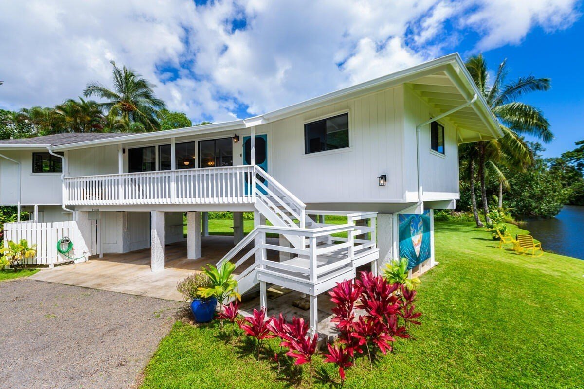 Welcome to Waioli Stream House, an iconic Hanalei home that offers the unique experience of living in one of the most sought after beach towns on the planet. Nestled on the western edge of Waioli stream, your only neighbors are swaying coconut palms and tropical birds. The beauty of the location is not only the easy accessibility to Hanalei town by bike or bare-feet but also the quick paddle access via the stream to Hanalei Bay and it's world class beaches and surf. The house provides a spacious layout with mirror image primary suites on each end of the home joined by a large living area and open kitchen. The screened-in lanai off the back boasts a beautiful river and distant ocean view. There is also ample storage in the carport below for your jet-ski, beach cruisers, surfboards and other toys. Serenity and accessibility truly make this home the best of both worlds and a rare offering at that.