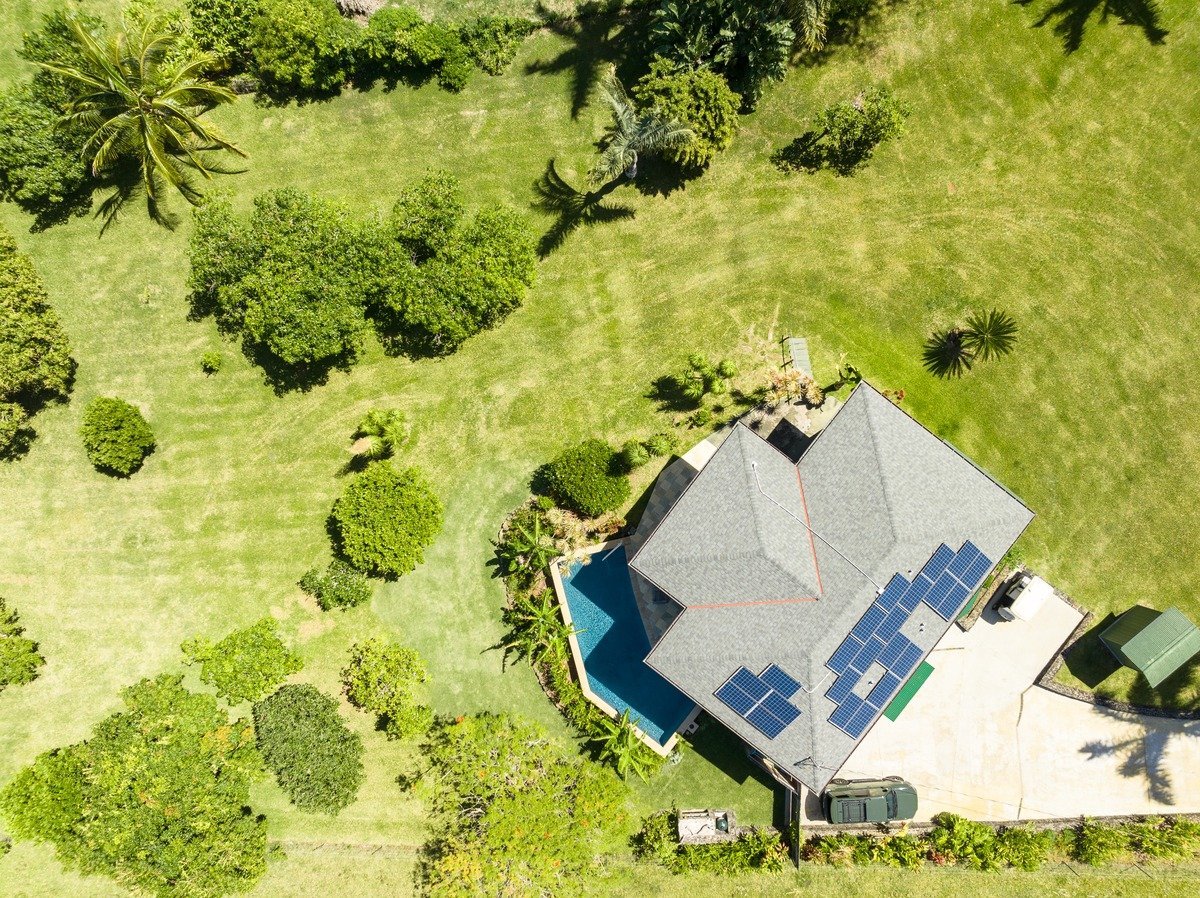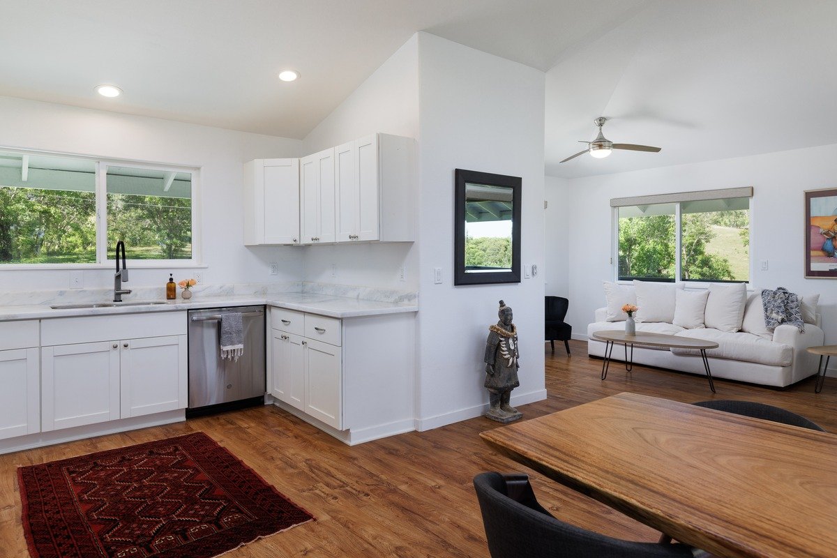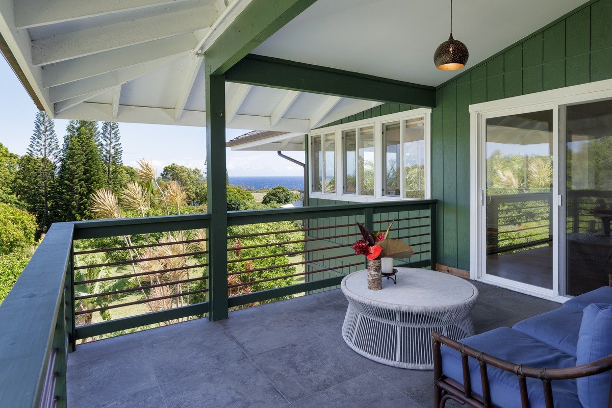 Manicured one acre in Makapala with impeccably maintained home, new custom pool, producing fruit orchard and dramatic ocean views.Nestled amongst the rolling hills of Makapala, in quiet North Kohala this property feels like a sanctuary. Privacy with an expansive orchard boasting dozens of producing trees: mango, avocado, orange, banana, lychee, surinam cherry, lime, fig and starfruit.Upstairs you'll find a bright, lofty kitchen with stone counters, stainless appliances and views across the neighboring pasture. A spacious dining area with ocean views, living area with powder room and a sliding door which opens to the covered lanai overlooking the pool and orchard. An oversized primary bedroom with ocean views, ensuite and private lanai.Downstairs, another living area and three bedrooms, one with french doors perfect for an office or gym. A chic remodeled bathroom with double vanities, wall to wall stone and a walk in shower with glass enclosure, laundry room and french doors opening to the pool deck.The custom gunite pool built in 2020 overlooks the stone barbeque area, tropical gardens and spacious orchard. Photovoltaic with Tesla battery wall supporting the home to reduce grid dependence!Updates since 2019: -custom pool -concrete driveway -lava rock walls -wooden gate and fence at entry -entire property fenced with hog wire -downstairs bathroom remodeled -lanai railing rebuilt -interior paint -entry with ʻōhiʻa posts and hammered copper doors -various new lighting fixtures and fans -custom blinds throughout -golf cart to pick fruit included in sale