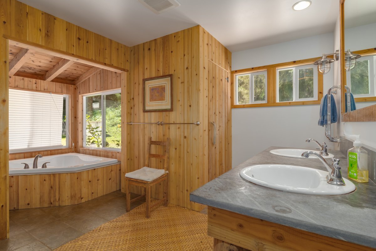 Impeccably renovated primary bedroom and bath are strategically separated from the other two bedrooms, with an open floor plan allowing for easy master bath access. The light-filled master bedroom is enhanced by a beautiful and private redwood deck.