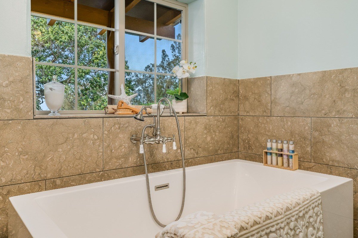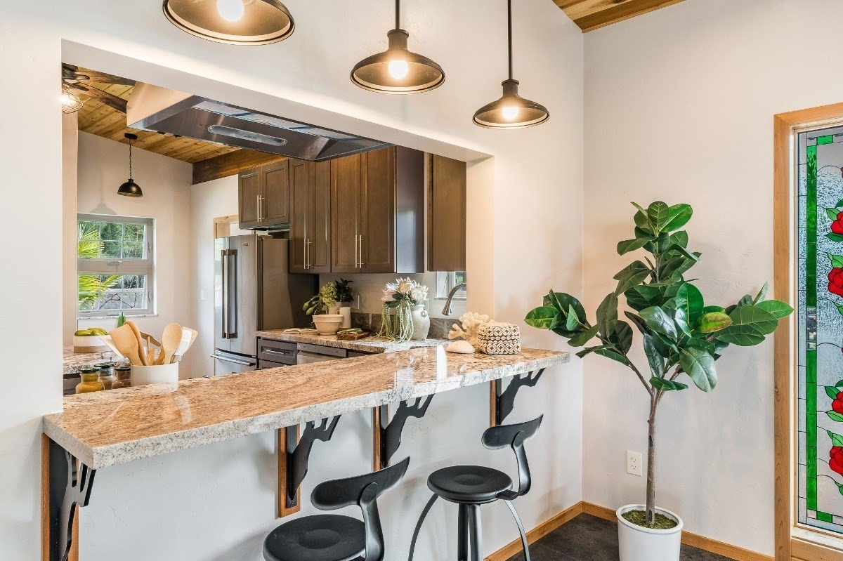 This completely renovated home is situated on a ½ acre with exceptionally lush, mature landscaping in Hawi, North Kohala. Stripped down to the ground, this original plantation style-home was given a full rehabilitation and is a completely new home! High vaulted cedar ceilings grace the living room and kitchen with cedar trim throughout the entire home. Insulated double wall construction, double-pane windows, and mineral rock insulation within the ceilings provide a steady temperature year-round with the addition of sound proofing the interior. Granite countertops in the kitchen and laundry room, energy efficient appliances, on-demand propane water heater, awning windows on the windward side of the home and a whole house water filtration system are just some of the notable features of this newly renovated home.