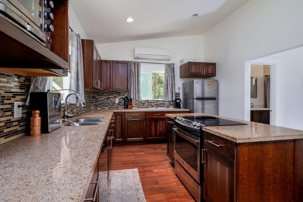 The upper level has a beautiful kitchen, living room and the primary bed and bathroom with a split AC system for perfect climate control. There is a lanai on the upper level with access to the living room and primary bedroom.
