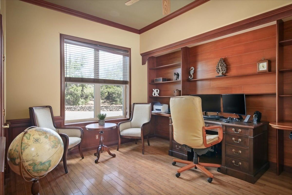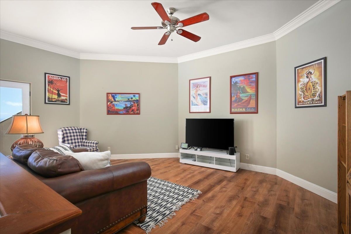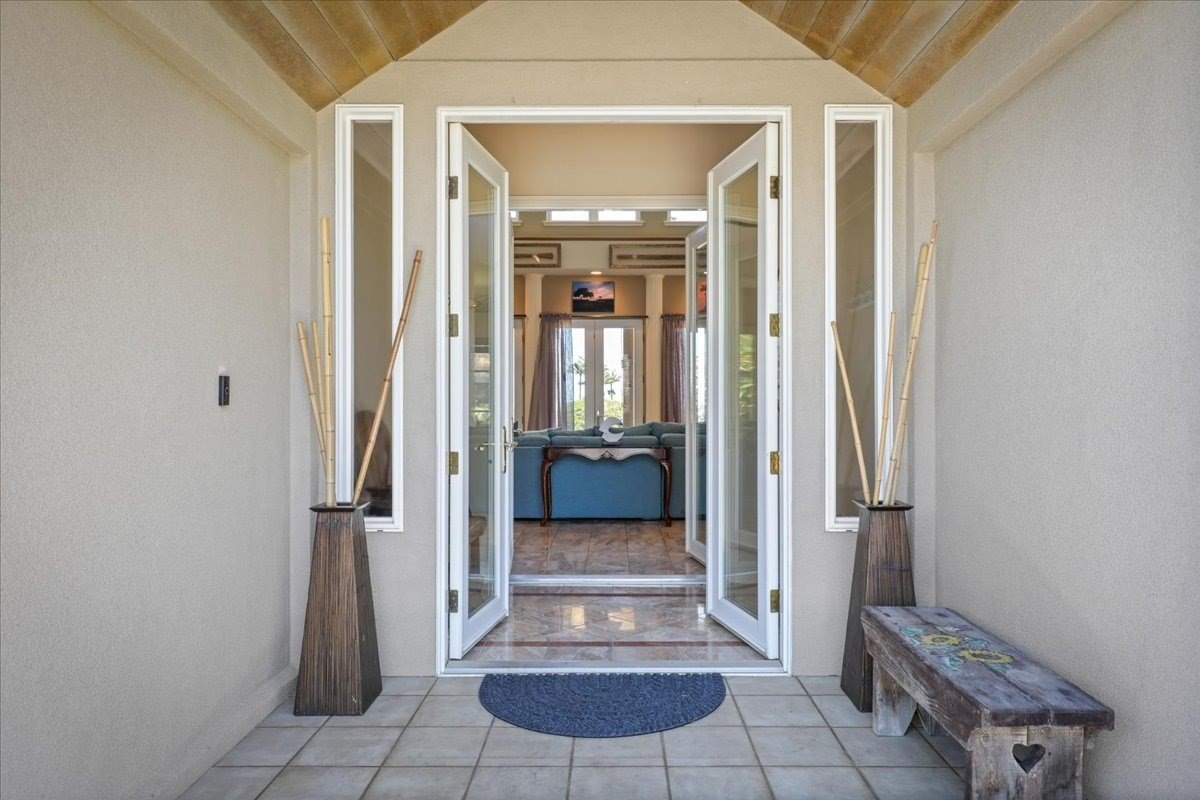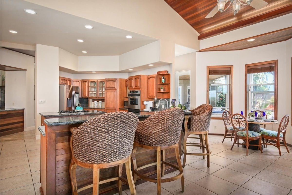 Ocean & pool views greet you as you enter this stately 4 bed/5 bath home + office space. A foyer leads to the spacious living room which opens to a large backyard w/ covered lanai & solar heated swimming pool. A wood-accented library/office sits to the left of the front entrance - a formal dining room sits to the right. The main gathering space of this home is a welcoming family room, boasting redwood-paneled cathedral ceilings & oversized marble fireplace. It opens to the chef's kitchen & informal dining area. The kitchen features a large granite-topped breakfast bar & island w/ gas cook-top. Two built-in ovens are integrated into the custom maple cabinetry. There is an abundance of storage, including a huge walk-in pantry. A large laundry rooms sits close by; also direct access to the over-sized three car garage.