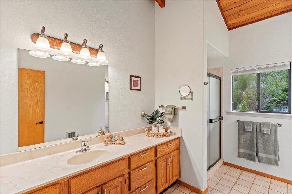 This stunning Kula property is a true gem, offering breathtaking bi-coastal views from its expansive 825 sq. ft. deck. The primary residence, featuring 2,885 sq. ft. of beautifully designed living space, boasts vaulted ceilings, custom cabinetry, and a cozy stone fireplace, creating a warm and inviting atmosphere. The lower level provides an additional 1,270 sq. ft. with its own separate entrance, making it ideal for multiple living arrangements or guest accommodations. The property also includes a charming 585 sq. ft. one-bedroom Ohana, complete with its own private patio and raised garden beds, ensuring both privacy and comfort. Parking is ample, accommodating up to five vehicles, and both the main home and Ohana are equipped with separate electric meters and net metering systems for added convenience and efficiency. Additional features include a two-car garage with a dumbwaiter for easy access to the kitchen, a 448 sq. ft. barn, and a fully enclosed 1,728 sq. ft. pool house, perfect for entertaining year-round. The pool house includes a solar heating system, providing comfort regardless of the season. The property is further enhanced by beautifully landscaped flower beds and a variety of mature fruit trees-such as citrus, bananas, and avocados-as well as herbs like rosemary, mint, and bay. With updated roofs and a new Health Department-approved septic system installed in 2022, this meticulously maintained property offers a serene, park-like setting, defined by four rock walls that elegantly enclose the gently terraced grounds. This unique opportunity to own a piece of paradise in Kula combines luxury, functionality, and natural beauty.