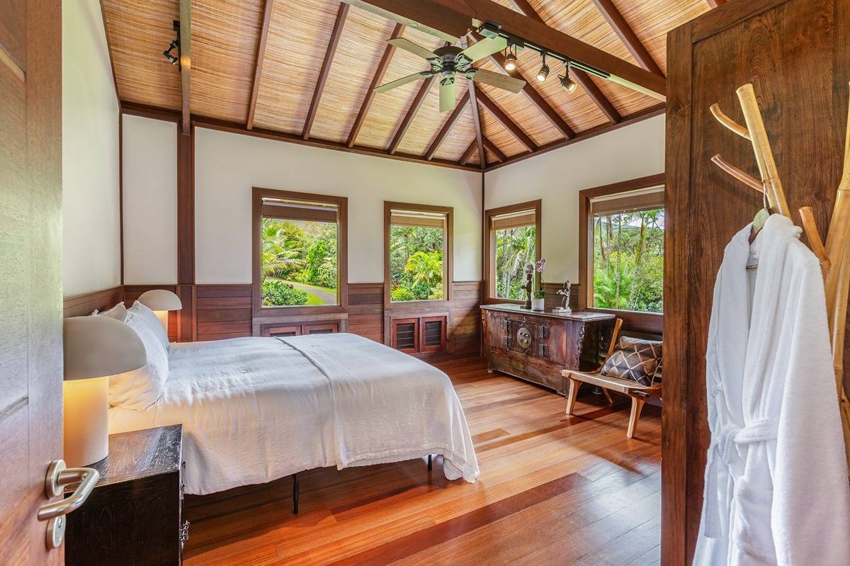Tucked away in absolute seclusion, this expansive estate spans 3.5 acres and offers complete privacy and Bali-style luxury. With breathtaking views of Mt. Namahana as a picturesque backdrop, the 4502 sqft main residence offers four bedrooms and three and a half baths. The grand 1750 sqft great room, which includes a spacious gourmet kitchen, inviting living area, and elegant dining space, serves as the perfect venue for entertaining guests and large family gatherings. The separate bedroom suites are connected by open covered breezeways, leading to an outdoor living room-style lanai. Designed to embrace the tropical lifestyle, the residence offers extensive outdoor covered living areas and capitalizes on the refreshing tradewinds.Outside the great room, the infinity-edged salt-water pool and spa adorned with imported greenstone tiles create a captivating centerpiece, surrounded by over 3000 sqft of ipe decking and expansive outdoor covered living spaces. The spacious multi-purpose open living area downstairs is currently used as a gym. Additional features include an oversized two-car garage, air conditioning and a private detached "writer's cottage.” Distinguishing itself within the neighborhood, the house is meticulously framed with termite-resistant tropical hardwoods throughout. The home features a brand new cedar shake roof, complemented by copper gutters and rain chains. Lava stone accents adorn the exterior, while custom-carved stone art pieces are integrated into carefully selected areas of the home. Breathtaking tropical landscaping and water features complete the atmosphere.The short drive to Kilauea town offers numerous amenities and conveniences. World class golf is just a few minutes away in Princeville. Famed Hanalei Bay and countless breathtaking beaches and surf spots are also easily accessible from this ideal location on Kauai's North Shore. This is arguably one of the finest properties in Kalihiwai Ridge and the entire North Shore.