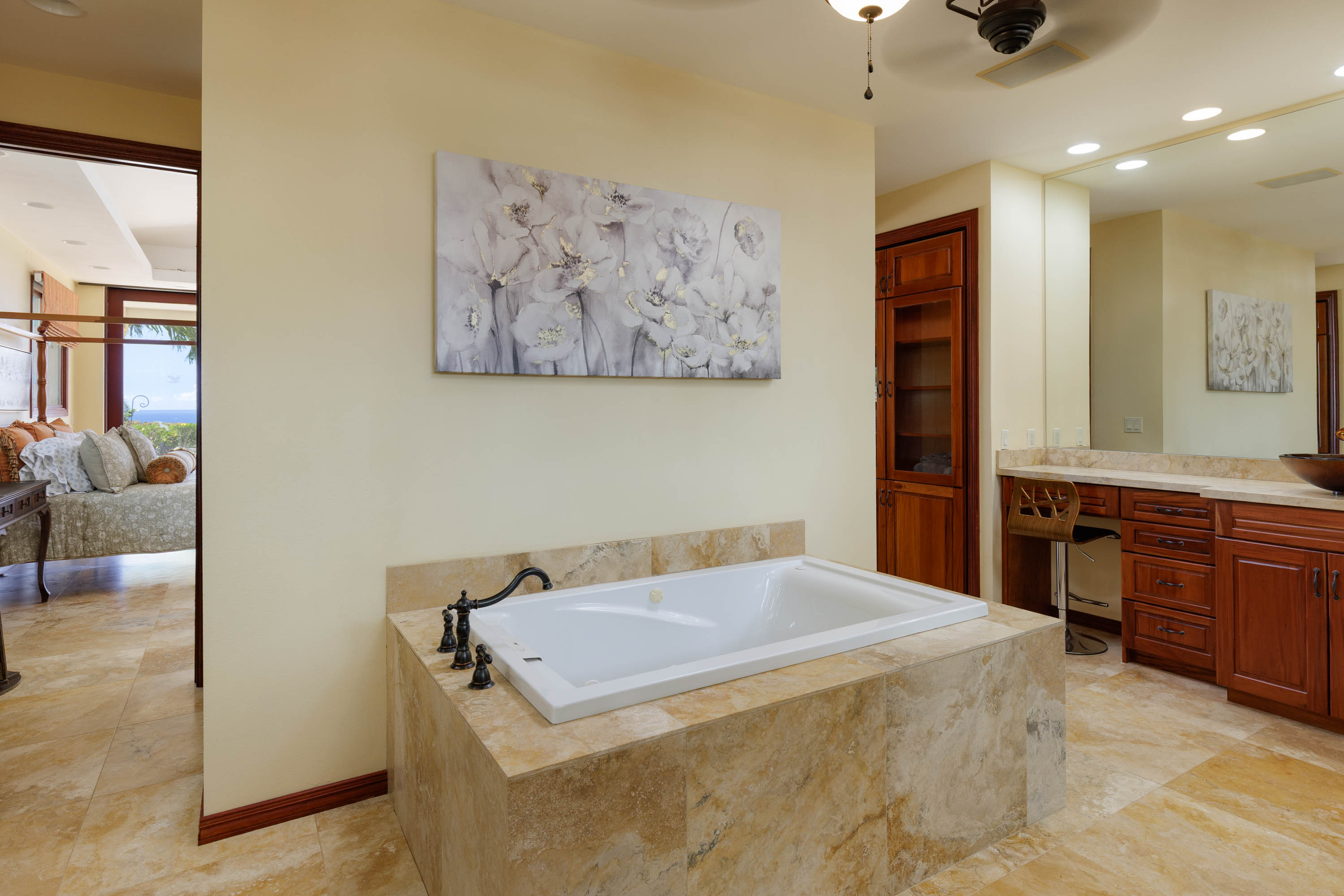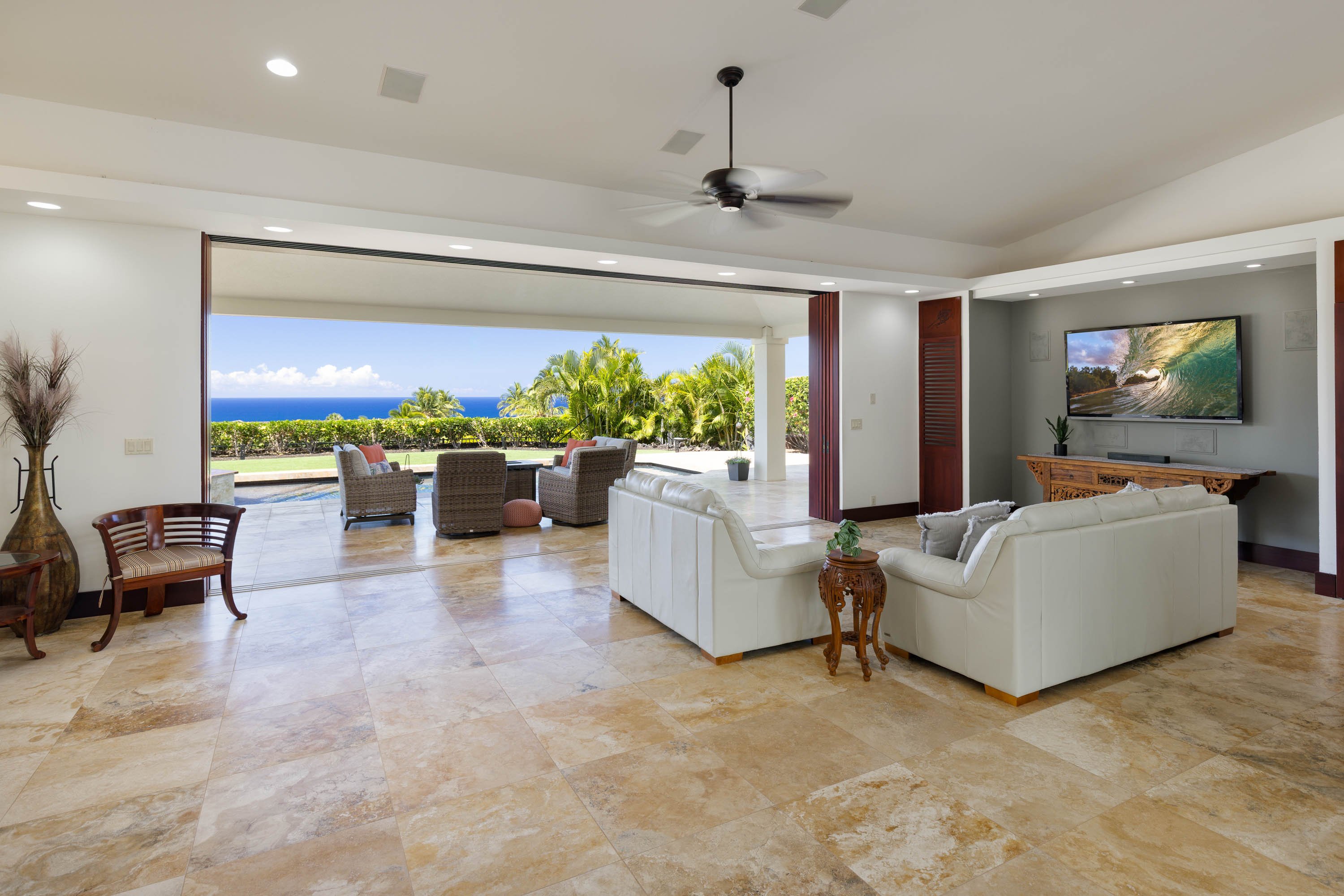 Nestled within the exclusive, gated community of Kohala by the Sea, this beautiful custom-built 3,400-square-foot residence offers panoramic ocean views that are nothing short of breathtaking—an unparalleled feature that truly defines the property. From nearly every room, the vast expanse of the Pacific Ocean stretches endlessly. Designed with both elegance and functionality in mind, the chef’s kitchen is perfect for entertaining. It's equipped with premium Thermador appliances, including a gas stove that any chef will appreciate. The large granite island with built-in refrigeration and a separate ice machine add both style and convenience. Rich mahogany cabinetry and copper sinks bring warmth and character, while the travertine floors flow effortlessly into the outdoor lanai, creating the perfect space for everything from casual get-togethers to large gatherings. This meticulously crafted home offers three generously sized bedrooms, each with its own en-suite bathroom, ensuring exceptional privacy and comfort. The primary suite is a sanctuary, featuring dual walk-in closets, dual vanities, a two-person shower, and a luxurious jacuzzi tub, all with the added luxury of those sweeping ocean views. For year-round comfort, every bedroom is equipped with split air-conditioning systems. Additionally, the home comes fully furnished, allowing for an effortless move-in experience. Set on a landscaped 1.1-acre lot, the property is graced with an array of fruit trees, including banana, mango, and lemon, adding vibrant color and delightful fragrances to the surroundings. The fully fenced backyard is an entertainer’s dream, featuring a saltwater pool and spa—the perfect oasis to unwind and immerse yourself in the serene tropical landscape while gazing out over the ocean. Noteworthy features of the home include 42 owned solar panels, a newly installed roof, freshly painted interiors and exteriors, and a recently serviced septic system.