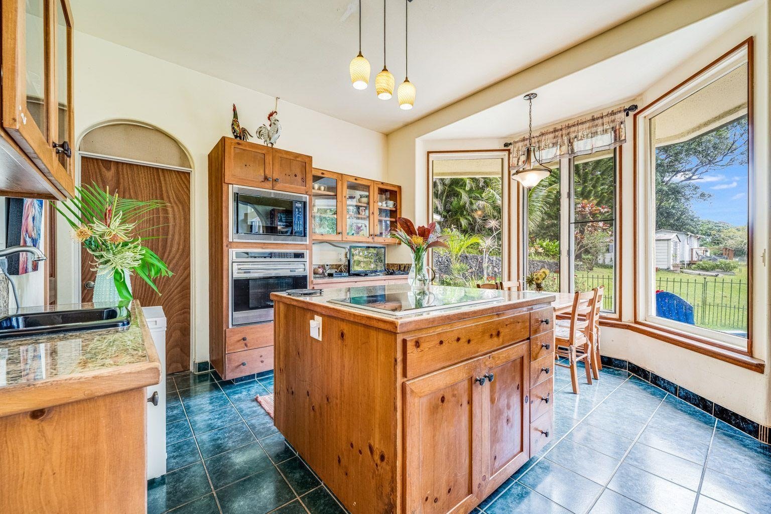 This large, custom built executive home blends stately features and tropical paradise perfectly. From the copper rain gutters, to the Peggy Hopper stained glass entry door, there are unique features throughout this Stephen Pitt designed European style villa. Surrounded with Hawaiian foliage and verdant land, the home sits on 1.25 level, usable acres and overlooks a large lawn. Fully fenced pasture. The stucco exterior and imperial plaster interior keep the home cool in the summer and the 2 stacked wood burning fireplaces keep it warm on those chilly winter evenings. Travertine flooring runs throughout most of the downstairs and a well-appointed kitchen contains an eating nook and 3 sinks for your convenience. Close to world famous Hookipa Beach, Mama's Fish House, private and public schools. Septic has already been installed. Come and see this truly amazing, one-of-a-kind north shore gem.