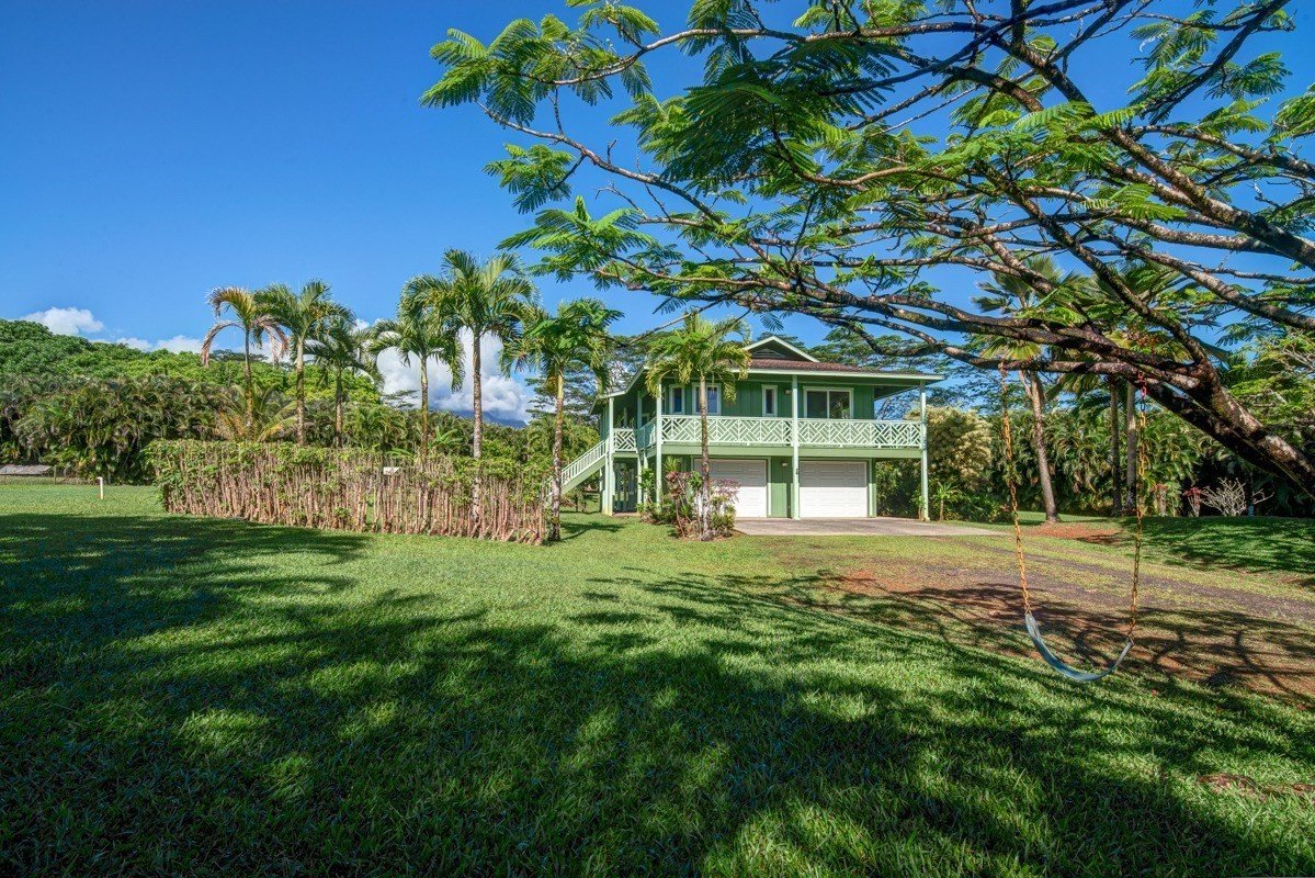From the foot of Mount Namahana, this three bedroom, two bathroom home features a large wraparound lanai for outdoor living that is designed to take advantage of the prolific mountain views. Between you and the mountain are approximately seven acres of your own beautiful pastureland. The kitchen features granite countertops and DeWils solid oak cabinets offering quality and durability. A cast iron wood-burning fireplace provides a great option for taking the chill off of winter nights. The property also includes numerous fruit trees such as navel orange, Valencia orange, tangerine, lemon, lime, grapefruit (ruby red), lychee, macadamia nut, apple bananas, dwarf Williams bananas, dwarf apple bananas, and cacao. This charming mountain farmhouse and pastureland totals nearly 9 acres of land - create your dream estate or a working farm of your own.