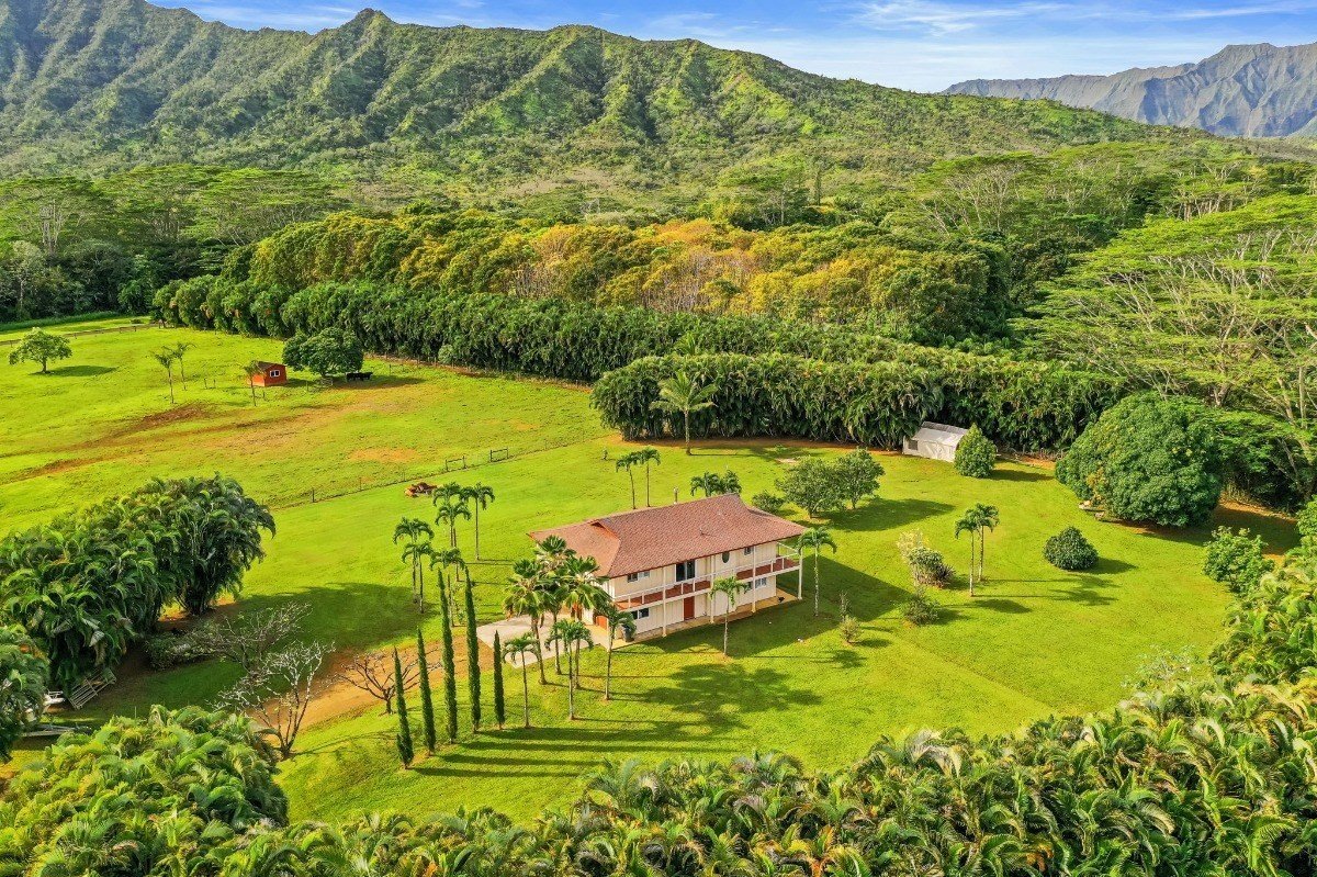 Nestled at the base of Mount Namahana, this pristine 8-plus acre estate captures the breathtaking beauty of the surrounding valley with endless possibilities! Escape into your very own island ranch wrapped with areca palms as you gaze out over the lush pastureland. The wraparound lanai from the second story welcomes you into this three bedroom, two bathroom charming country home. Cozy up to the cast iron wood-burning fireplace when the rain storms roll in during the winter. Feel the cool mountain breeze whisper through the windows during the warmer summer months. The expansive mountain views give you room to breathe while enjoying the privacy of your sweeping acreage. The Hunter Douglas shutters, granite countertops, solid oak cabinets, and vaulted ceilings add to the custom interior features of this residence. Enjoy harvesting from the many fruit trees sprinkled throughout the property or relax under the mango tree taking in the tranquility of the countryside.