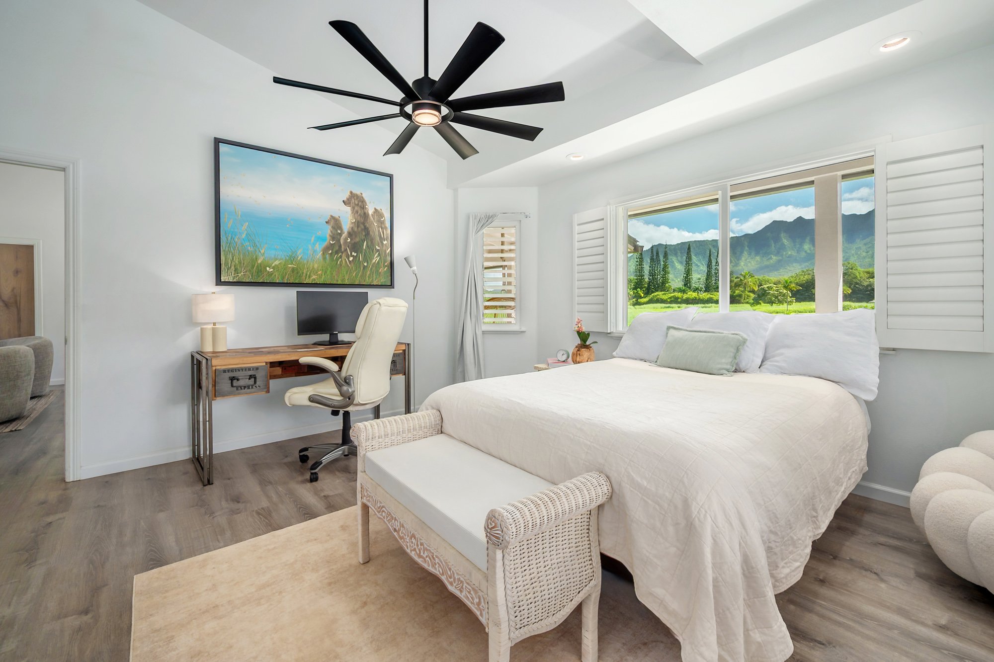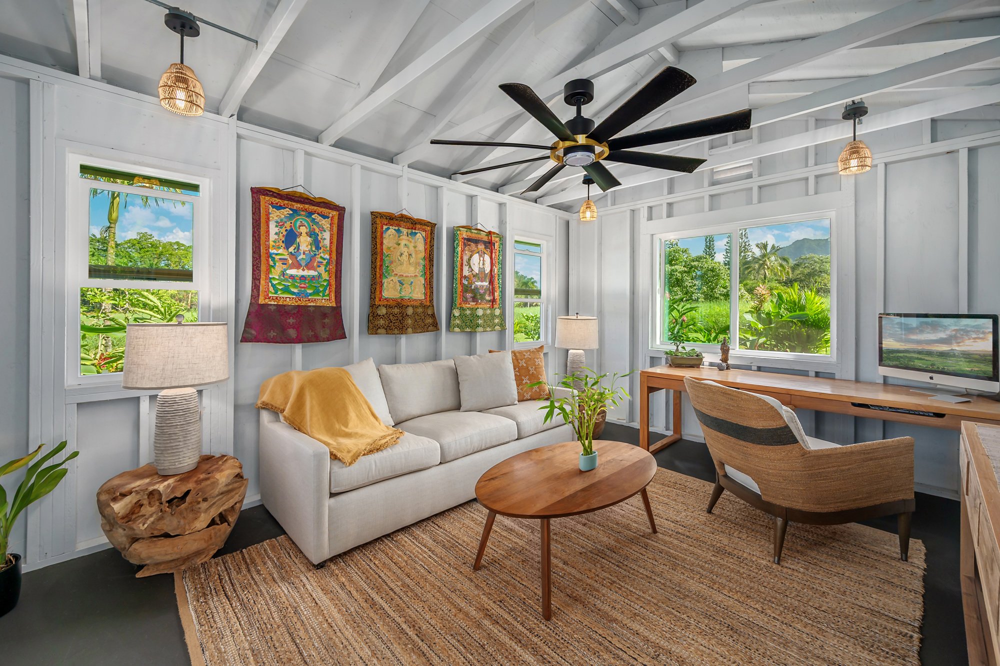 If you’re looking for a view property with generous acreage for farming pursuits, while staying just minutes from world-class beaches and the charm of Kilauea town, this North Shore estate may check all your boxes.Nestled at the base of Mt. Namahana, this nearly 9-acre farmhouse gated estate offers sweeping mountain views and a true country-living experience. The beautifully maintained main residence features 3 bedrooms, 2 baths, plus a bonus room ideal as a 4th bedroom. Interior details include vaulted ceilings, granite countertops, DeWils solid oak cabinetry, and a cast-iron wood-burning fireplace perfect for cool winter evenings. A detached office cottage provides added flexibility for work, guests, or creative space.A spacious wraparound lanai invites relaxed outdoor living with panoramic views of the surrounding mountains and pastureland. The property is fully fenced, with approximately seven acres of usable, level pasture—ideal for farming, ranching, or grazing animals. In the back corner of the property, a small stream runs through, offering a true sense of nature. There is also potential for a guest house and additional accessory buildings (buyers or buyer’s broker to confirm details with the listing agent and County agencies).The land is abundant with fruit trees, including Mango, Orange, Tangerine, Lemon, Grapefruit, Red and Yellow Guava, Mountain Apple, Sour Sop, Avocado, Papaya, and Macadamia. Plus flowering plants that include : Birds of Paradise, Ginger, Gardenia , and Hibiscus.Located in the desirable Kalihiwai Ridge community, this peaceful retreat is just minutes from Kilauea, Princeville, Hanalei, and Kauai’s most beloved beaches. Whether you envision growing your own food or a private estate, this property offers exceptional opportunity in one of the North Shore’s most desirable settings.
