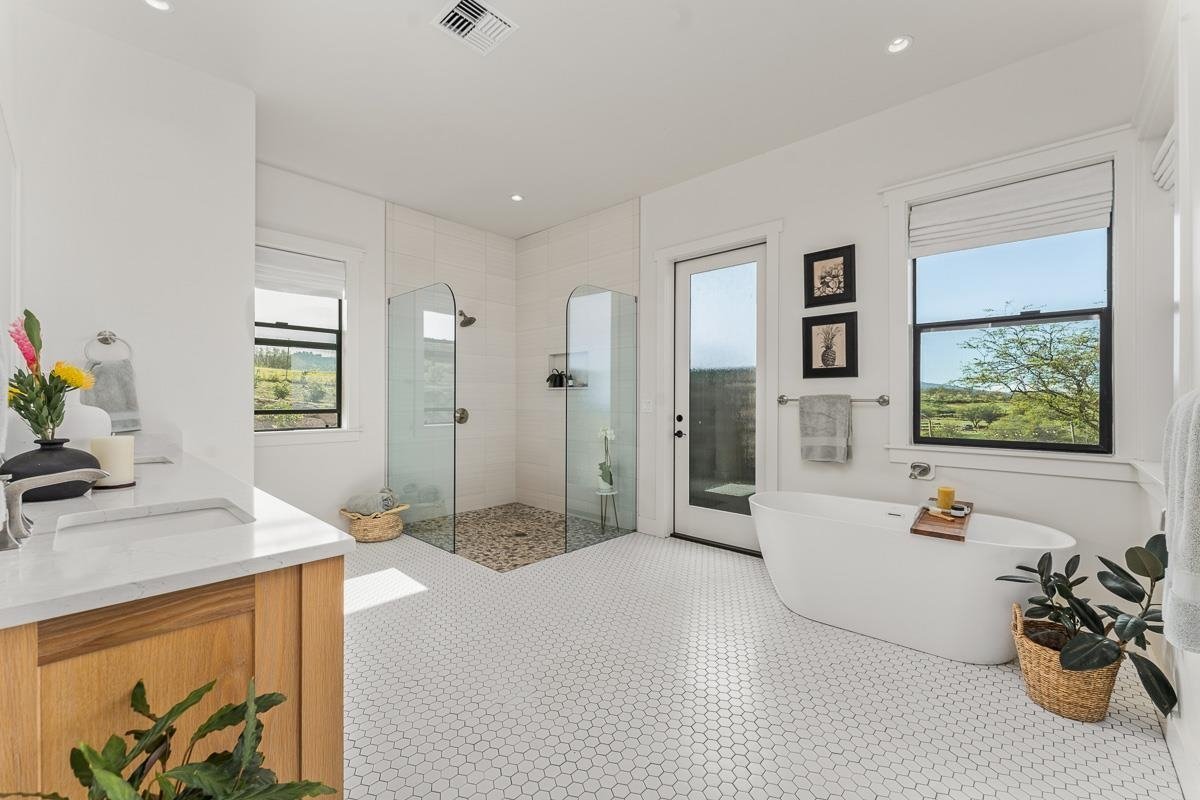 Stunning 5.5 acre property in the Kula Meadows gated community, featuring a newly constructed 4 bed / 3 bath primary residence with detached dual-door garage, 2 bed / 2 bath cottage, and big bi-coastal views with ample outdoor entertaining space. Both the primary residence and cottage are fully fenced with separate gated driveways. The primary home boasts an expansive great room with engineered hardwood flooring, vaulted ceilings, gas fireplace and gorgeous built-ins. The kitchen is welcoming with an oversized island, silestone countertops, custom white oak cabinets, gas range and stainless steel appliances. Enjoy meals in either your adjacent dining room or slide open the glass doors to your large covered lanai with travertine floors and dine al fresco with a view. The primary suite and guest bedrooms are in separate wings flanking the great room. The primary suite features a windowed walk-in closet, large porcelain-tiled bathroom complete with dual vanities, walk-in shower, soaking tub, and door to a private outdoor shower. The primary bedroom opens out to the covered lanai with ocean views. Three additional bedrooms and two bathrooms (one ensuite) complete the opposite wing, along with a dedicated laundry room and bonus loft space. Dual central AC systems keep the home cool in the summer months. The cottage also enjoys central AC, attached garage, large wrap-around lanai, luxury vinyl flooring, silestone kitchen counters, hickory custom cabinets and stainless steel appliances. The property is home to a myriad of citrus, mango, and avocado trees, and you can enjoy the outdoors with your own pickleball court, a full sized sand volleyball court with lights, picnic tables for gatherings next to your covered pergola, greenhouse with aquaponics system, storage shed, gazebo, and separate fenced-in areas for chickens and livestock. Call your favorite Realtor to schedule a showing today!