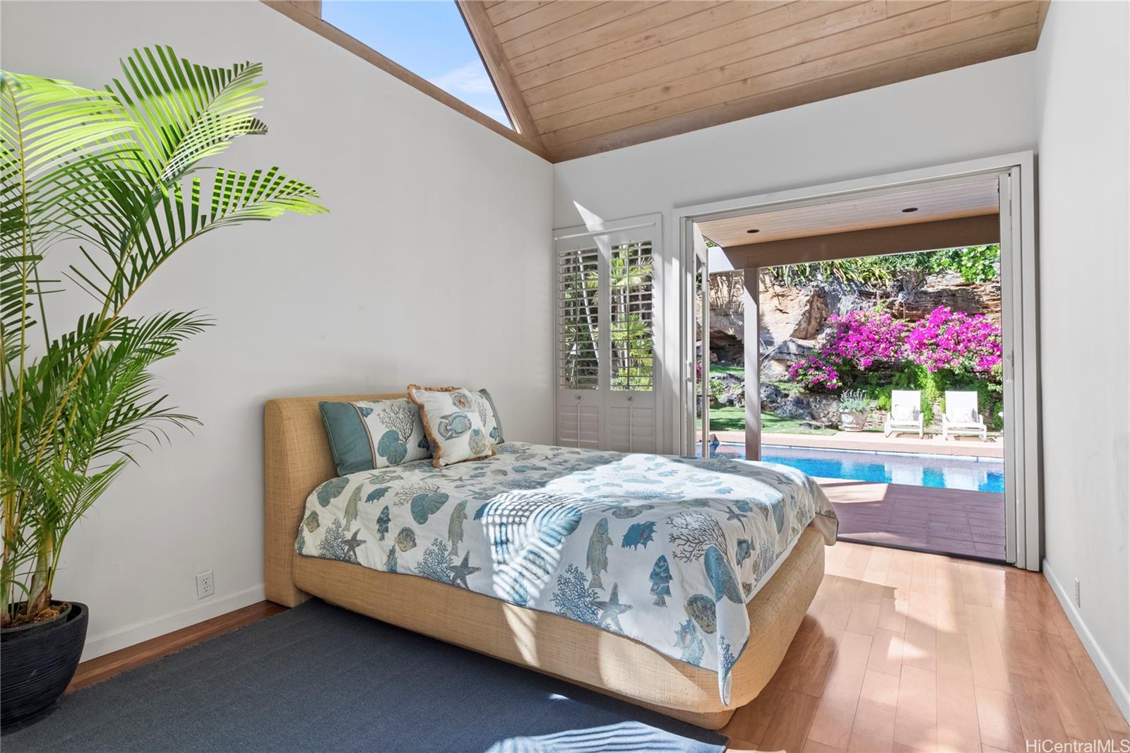 Enter through private gardens into this beautiful 4 bedroom/4 bath single level home that opens out to pool and nature setting in the back. Seamless indoor/outdoor living plus a separate bonus room above the garage. Fully walled in for privacy with new living room engineered wood floors, PV panels and glass panel garage doors. Dramatic open beams and windows throughout to catch the natural light. A serene and private setting. Welcome to your peaceful retreat.