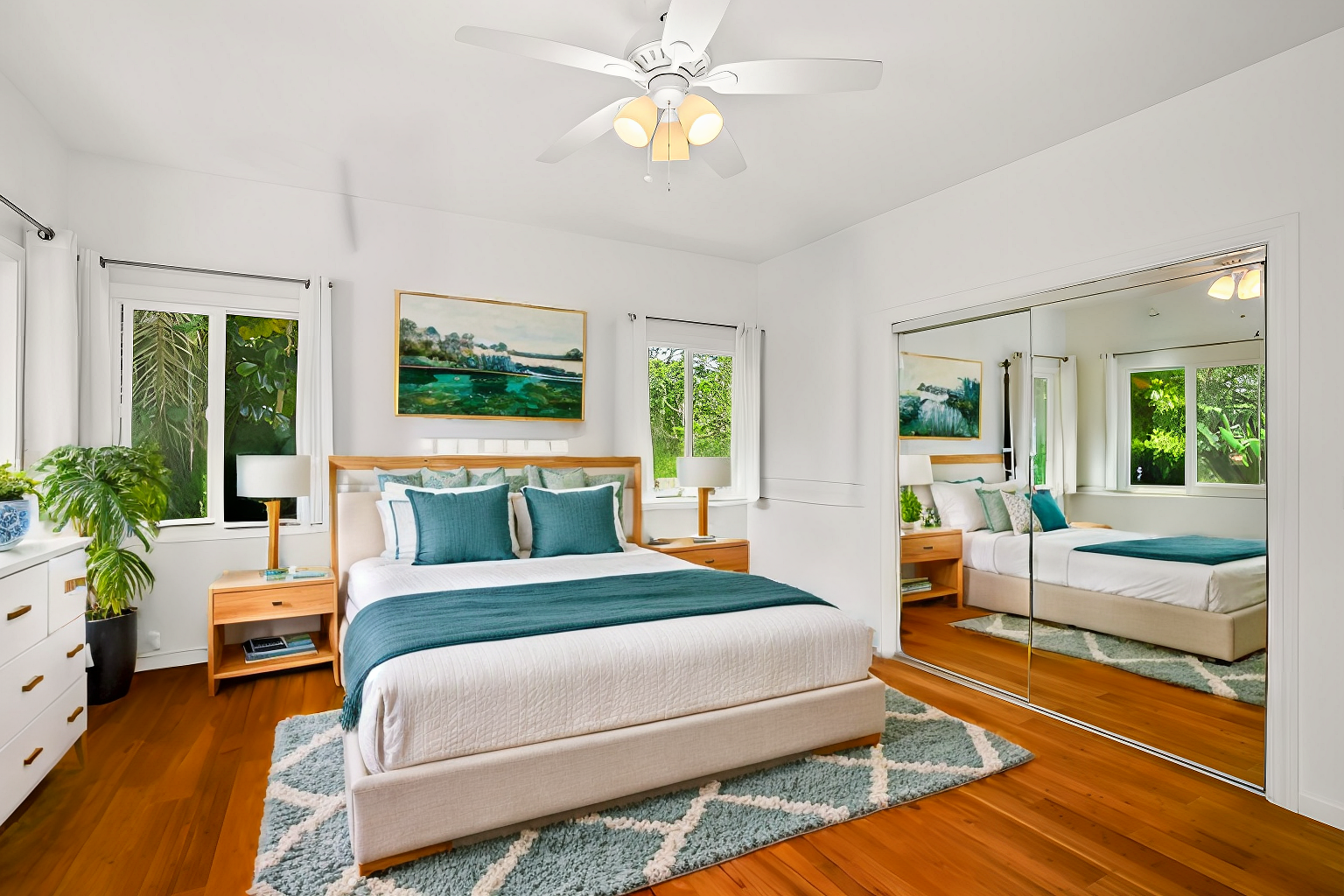 Surrounded by green spaces and cooling tradewinds, the lanai is perfect for relaxing any time of day. The primary suite includes French doors opening to the lanai; an adjacent bathroom complete with double vanity, tile floors, and a soaking tub.