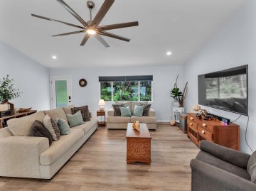 This lovely cottage features 2 Bedrooms and 2 Baths including a loft area that has multi functional uses. Home features high ceilings throughout, with views of Mauna Kea and Mauna Loa. This little gem has a very spacious outdoor protected deck that is perfect for entertaining. Wonderful privacy with windows galore and skylights that keep this home bright and cheery no matter what the weather is like outside and includes loads of storage underneath the house. This is a really cool little pad with a wonderful vibe; not a boring box; architecturally interesting and definitely a "must see". Loads of potential. House has been newly painted inside and out and floors including outside deck, sanded and stained. Wonderful private front and back yard; lush and green. Close to Waimea town, shopping, schools, hospital, community theatre, etc.
