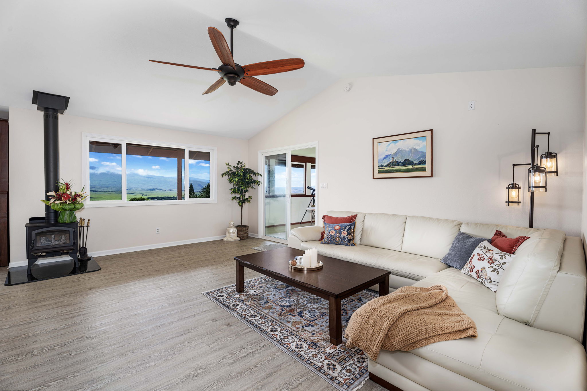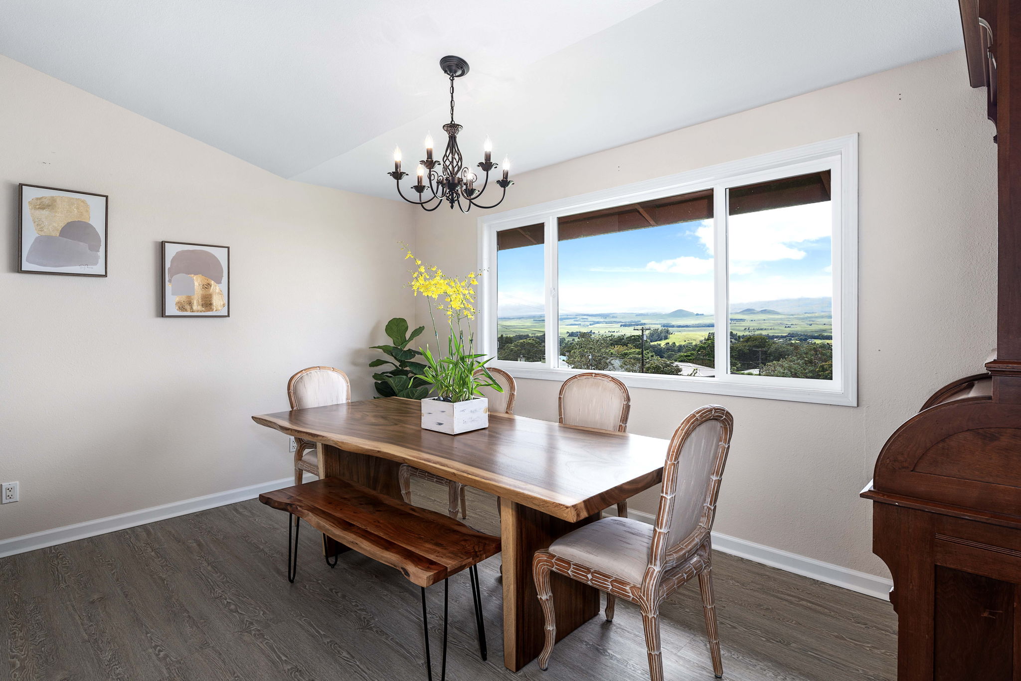 Step into this enchanting upcountry home, where the warm and welcoming ambiance immediately draws you in. As soon as you enter, your eyes will be drawn to the stunning, panoramic view of Mauna Kea, framed perfectly through brand new windows that flood the living and dining areas with natural light. This move-in ready home, featuring 3 bedrooms and 2.5 baths, has been thoughtfully updated and freshly painted throughout, creating a clean, bright, and inviting atmosphere. The living room, with its cozy wood-burning fireplace, offers a perfect space to unwind after a long day, while the large, enclosed lanai invites you to sit back and enjoy the spectacular views and fresh mountain air year-round.The heart of this home is the well-appointed kitchen, which boasts sleek granite countertops, modern stainless steel appliances, and plenty of cupboard and pantry space to meet all your storage needs. The low-maintenance laminate flooring throughout adds a stylish yet practical touch.The comfortable primary suite includes the ensuite bathroom featuring a twin vanity, separate double head shower and large soaking tub. The additional two bedrooms are equally bright and airy, perfect for family members, guests, or a home office setup. A separate laundry room equipped with a washer and dryer while the half bath is ideally located for guests.The home also comes with a spacious 2-car garage, complete with a brand-new electric garage door, providing plenty of room for parking, storage, or even a workshop. The large, grassy backyard provides plenty of room for outdoor activitiesJust a quick 5-minute drive to downtown Waimea, you'll have easy access to everything you need – from top-rated schools and grocery stores to farmers markets, and a wide range of restaurants.With its stunning views and unbeatable location, this home offers a rare opportunity to enjoy a peaceful, rural lifestyle without sacrificing the conveniences of town.