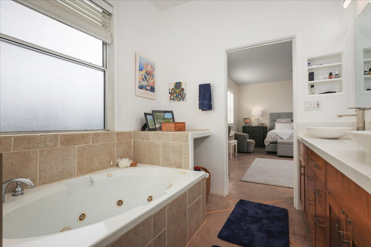 Relax by the cozy gas fireplace or retreat to the spacious primary bedroom, which includes an ensuite bathroom with a jetted tub and a walk-in closet. The bathrooms feature custom cabinets with quartz countertops, adding a touch of luxury.
