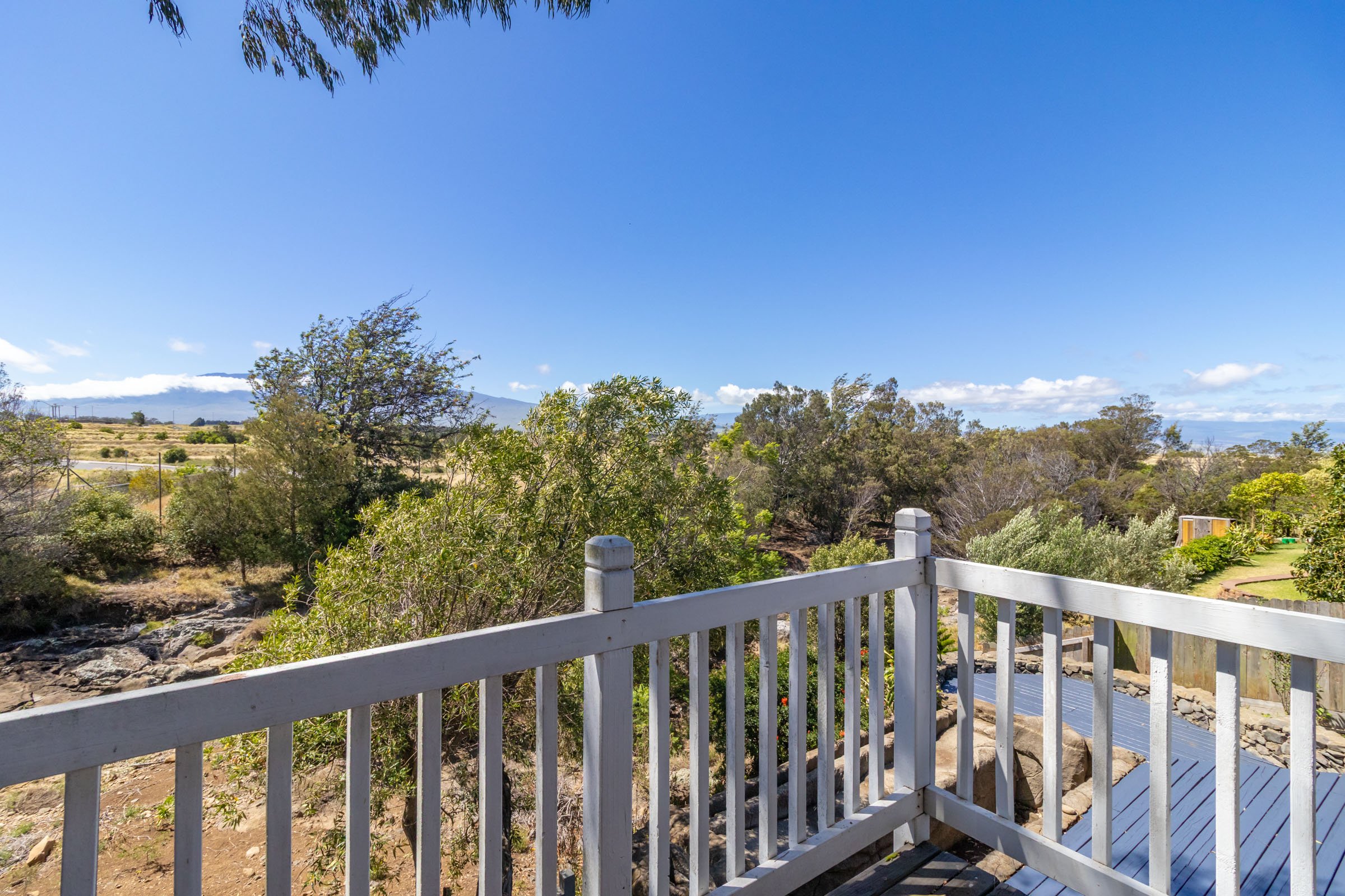 Out back, a nice open sun deck overlooks seasonal Keanuimano stream and frames beautiful views of Mauna Kea. The plunge pool and hot tub add a playful touch—perfect for relaxing or entertaining. A covered front porch offers protection from the elements, while mature landscaping in the large side yard give the home a sense of privacy despite its central location.
