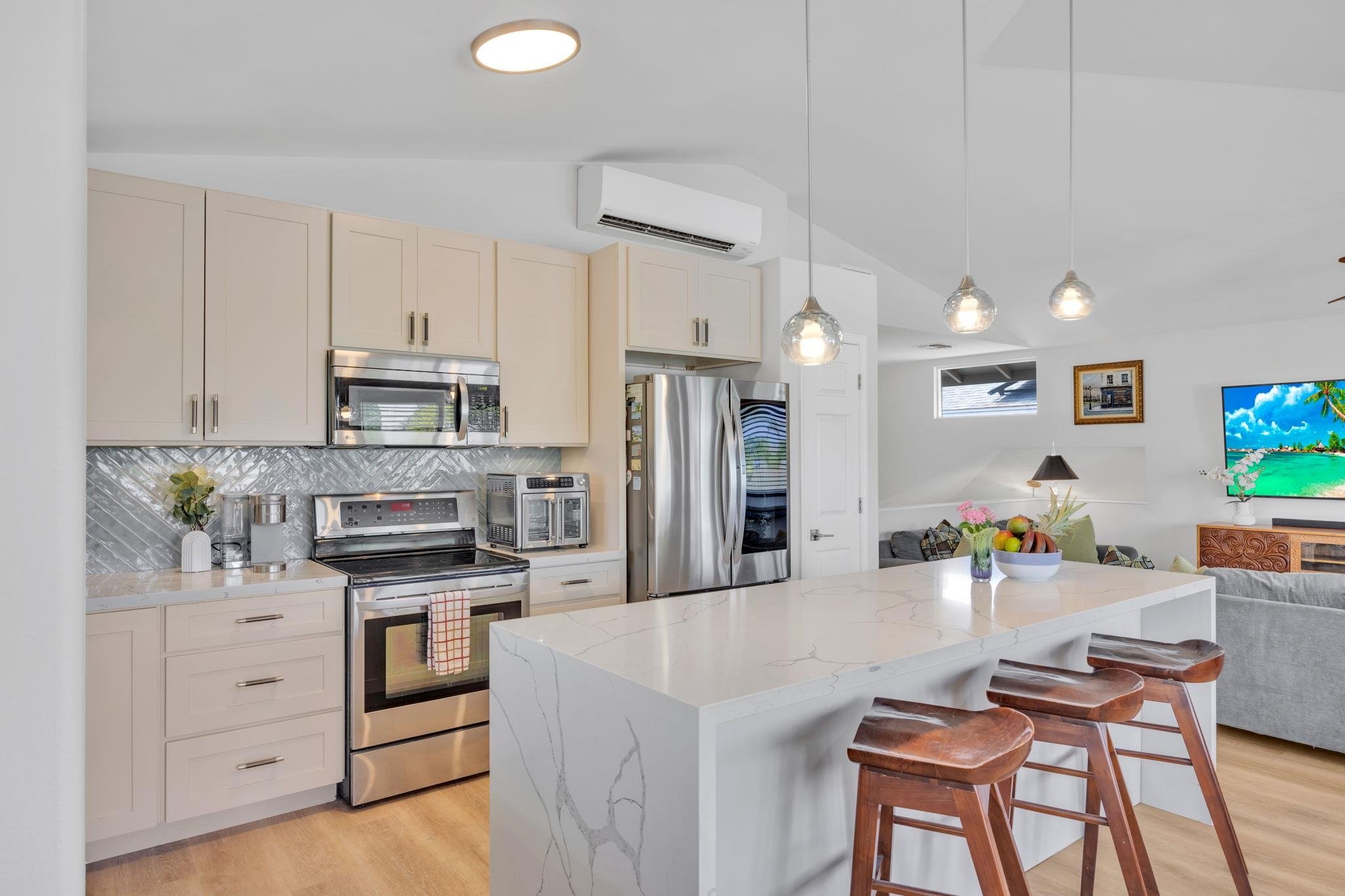 Recently completed, this extensively renovated home with salt water pool has been meticulously re-worked from top to bottom to create a contemporary modern feel throughout with a host of upgrades that are sure to impress! This private oasis is equipped with a multitude of energy efficient features such as a 41 panel owned PV solar system and solar hot water heating with 6 zones of AC for perfectly balanced climate control throughout the home. On the upper level you will find an open concept floor plan seamlessly blending kitchen and living space with a full guest bath off the living room and a spacious primary en-suite with a custom spa inspired bathroom and oversized walk-in shower, walk-in closet and massive upper deck overlooking the pool and neighboring orchards. On the lower level you will find a well-designed entertaining space centered toward the newly refinished pool and pool deck with ample outdoor space and custom volcano inspired water feature. Additionally on the lower level there are two guest suites and full bath with walk in shower with an added oversized family room with separate wet bar area that can act as a lower kitchen when entertaining. Situated in desirable Meadowlands neighborhood, this home is within close proximity to beaches and many top choice dining and shopping options in South Maui. Home can be sold furnished.