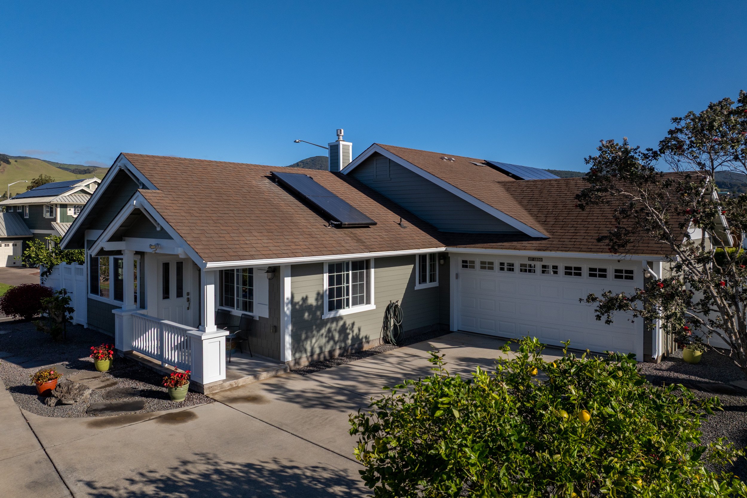 Impeccable 3 bedroom/2 bath gem in the heart of Waimea Town! You will be hard pressed to find a more beautifully maintained and updated home at this price. Fully resurfaced in 2024 and 2025, with newer appliances. Features include a 14 panel, fully owned Net Metering Photovoltaic System, lush landscaping, a Tesla power wall for back up electricity and so much more!Come home to Luala'i at Parker Ranch in this One-Owner, Honua floor plan. Single level living with no immediate neighbors on 3 sides, making this cozy space feel private and serene. A covered lanai off of the great room provides a perfect shelter from those breezy Waimea nights. The Primary bathroom has been richly upgraded and a recently upgraded remote controlled, gas fireplace provides ample warmth in the great room.Quartz countertops throughout and luxury vinyl plank flooring make this sweet home feel modern and fresh. The exterior was just recently painted along with several interior rooms. This home feels nearly new, but with the benefit of mature landscaping, including prolific Citrus trees, Hibiscus, Bottle Brush, Podocarpus and Ohia trees. Located at the end of a quiet Culdesac with impressive views of Mauna Kea and the Kohala Foothills.