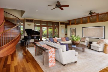 Experience fusion of Asian-inspired design and Hawaiian elegance in this meticulously furnished and decorated architectural OCEANFRONT masterpiece, crafted by renowned Hawaii architect, Warren Sunnland. Built from exquisite clear cedar, teak, and natural stone, this residence blends seamlessly with its serene island setting. Situated at the end of a gated private road, follow a tranquil stone pathway that winds through bubbling koi ponds, leading to an inviting entrance into an expansive great room designed to flow effortlessly into an open-concept kitchen and dining area, perfect for gatherings and intimate moments alike. Through seamless teak pocket doors, the stunning covered oceanfront lanai merges indoor and outdoor living. This generously sized dining and lounge area with ample seating, sets the scene for poolside relaxation with panoramic views of whales breaching, sunsets on the Pacific Ocean, the rugged South Kohala coastline, and glimpses of Maui. One side of the residence offers a private 1,700 +/- square-foot primary suite serving as your private sanctuary. The spacious bedroom opens to sweeping ocean views, while a luxurious bathroom, oversized walk-in closet, and secluded outdoor shower provide an unparalleled sense of comfort. An adjacent oceanfront office offers inspiring coastal views, perfect for remote work or quiet contemplation. One additional bedroom, office and sitting room and a shared bathroom are thoughtfully incorporated adjacent to and part of this primary wing. On the north side of this intriguing estate, accessed by a hallway adorned with a 50m year old fossil wall, you'll find four generously sized bedroom suites, a large media room, and their own pantry and laundry area. Two of these suites offer private lanai and sumptuous ocean, coastline and Mauna Kea views! Room to expand this compound is also available through the acquisition of the adjacent 1 acre oceanfront parcel, TMK 3-6-8-36-3, for $6.9m. Truly one of a kind!