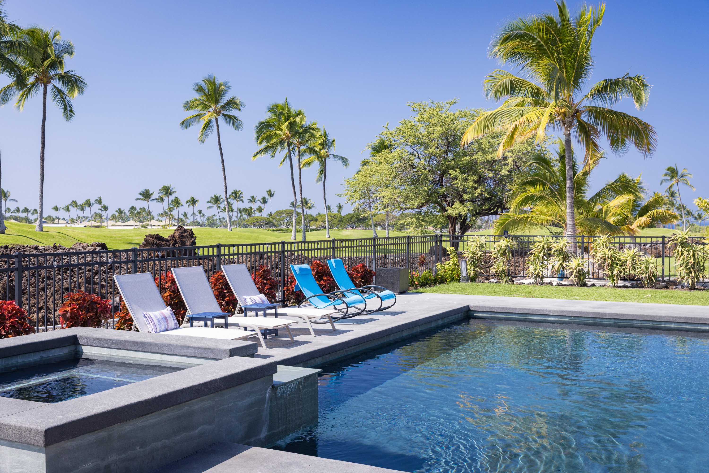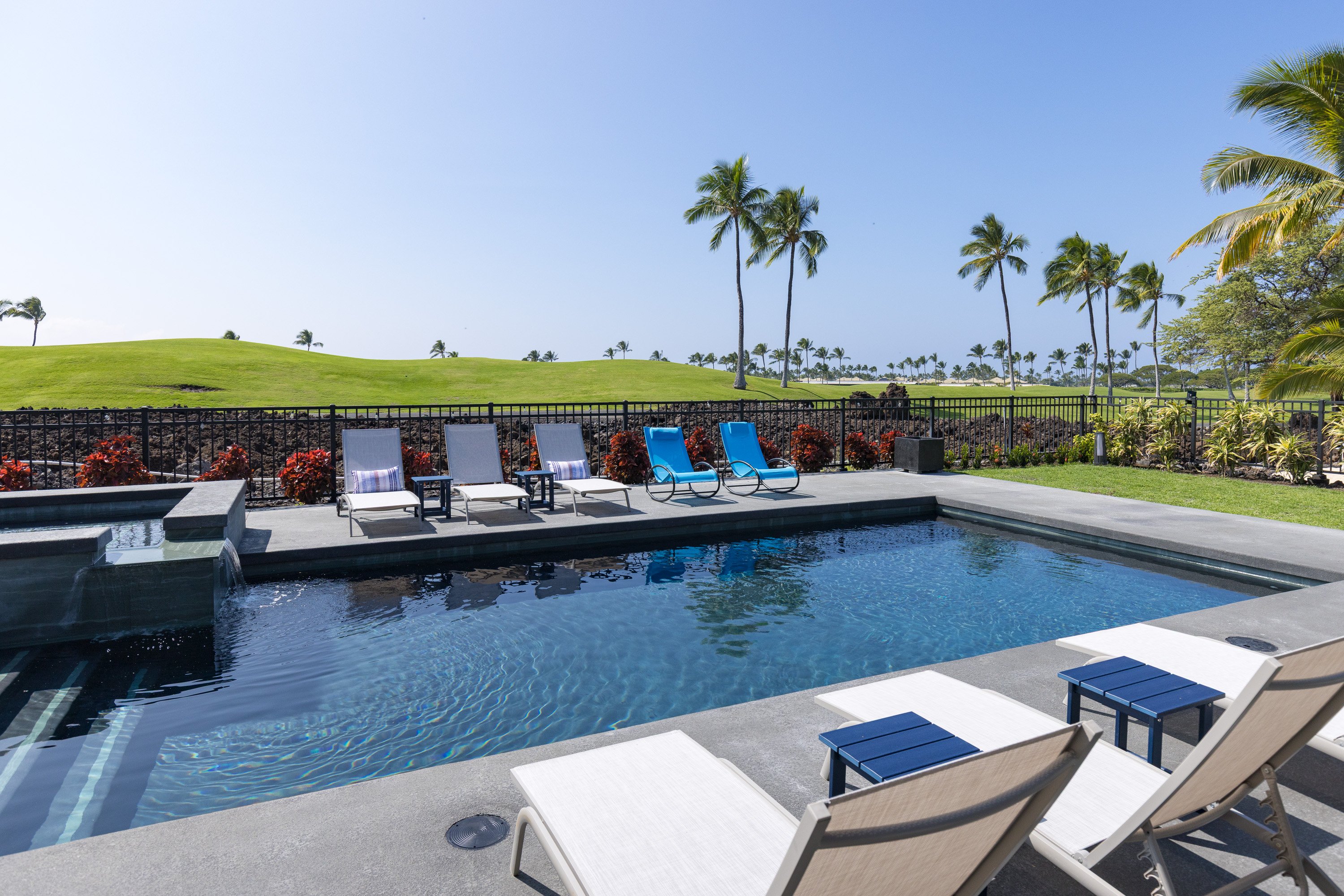 Experience elevated island living in this brand-new, smartly furnished 4-bedroom, 4.5-bath resort residence with office, pool, and spa, ideally located beside the Mauna Lani Golf Club within Champion Ridge, a low-density gated community in the prestigious Mauna Lani Resort. Showcasing a rare soft contemporary design, this home blends modern sophistication with relaxed Hawai‘i luxury.The dramatic great room features 21+ foot ceilings and seamless indoor-outdoor living. The open layout is ideal for entertaining, with a dining area that seats up to 12 and a modern chef’s kitchen with luxury appliances. A spacious walk-in pantry adds convenience with an extra refrigerator, dishwasher, and wine cooler, while the main level includes two suites for comfort and flexibility.The primary suite is a private retreat with a lanai facing the golf course, a custom walk-in closet, and a spa-inspired bath with dual vanities, a sunken soaking tub, and indoor and outdoor showers. A dedicated office—currently furnished as an additional living room—offers versatility, and the downstairs guest suite comfortably accommodates two queen beds.Upstairs are two expansive guest suites, each with a private lanai—one overlooking the golf club and the other toward the Kohala Mountains. A large upper deck with ocean views creates a welcoming space for gatherings.Outdoors, enjoy a spacious lanai with a pool and spa overlooking the golf club, BBQ and a fire pit that enhances the tranquil ambiance.Additional highlights include short-term vacation rental eligibility, low HOA dues, water filtration system, a leak detector, and a 6-seater neighborhood electric vehicle.Homeowners enjoy exclusive access to the private Mauna Lani Beach Club, an oceanfront retreat along a protected bay featuring the renowned Napua Restaurant. Optional memberships are available for golf and combined golf/sports/tennis programs, offering access to the resort’s premier amenities.