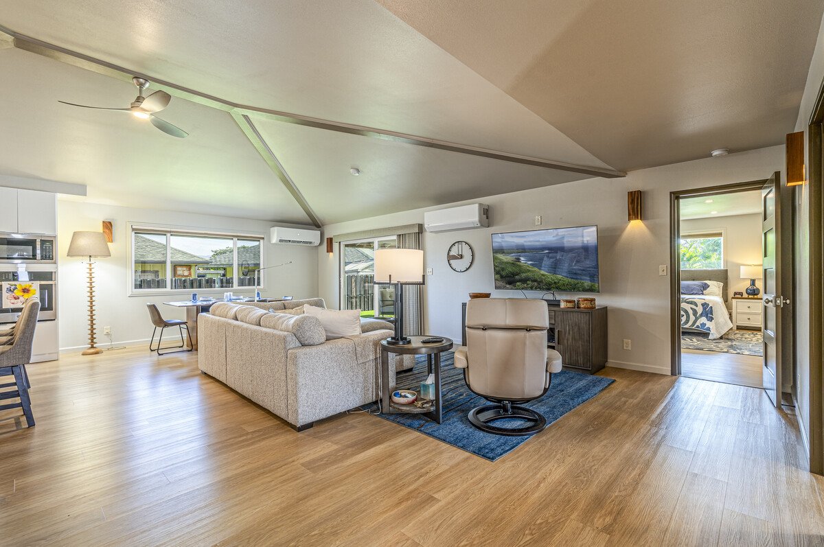Turnkey, fully furnished, and truly move-in ready. This nearly new 3-bedroom + office/den, 2.5-bath home offers modern comfort and easy island living, set at the end of a quiet cul-de-sac on over a quarter acre lot. Built just 2.5 years ago, the approx. 2,000 sq ft open-concept layout connects the living, dining, and kitchen spaces with excellent flow, abundant cabinetry, and a generous pantry. The split floor plan provides added privacy for the primary suite, while all bedrooms are spacious and furnished with king-size beds. Split A/C in every bedroom and the main living area ensures year-round comfort. A large, covered lanai extends the living space outdoors—ideal for relaxing or entertaining. The landscaped yard is private and peaceful, featuring multiple citrus trees that enhance the home’s serene island setting. Additional features include a dedicated office/den, two-car garage, solar hot water, and modern systems consistent with newer construction. Conveniently located near golf, beaches, shopping, dining, and resort amenities, with the added benefit of Waikoloa Village’s cooler elevation and strong community feel. Well-suited as a primary residence, second home, or a potential long-term investment. Property Highlights • Fully furnished | Turnkey • Built approx. 2.5 years ago • 3 bedrooms + office/den (optional 4th bedroom) • Split floor plan for primary bedroom privacy • King-size beds in all bedrooms • 2.5 bathrooms • Approx. 2,000 sq ft interior • ¼-acre cul-de-sac lot • Large 2-car garage • Large, covered lanai • A/C in all bedrooms & living areas • Solar hot water • Extensive kitchen with pantry • Landscaped yard with multiple citrus trees • 50-amp car charger • Wine cooler and additional refrigerator Waikoloa Village has a mandatory HOA and dues are currently $1,120 annually.