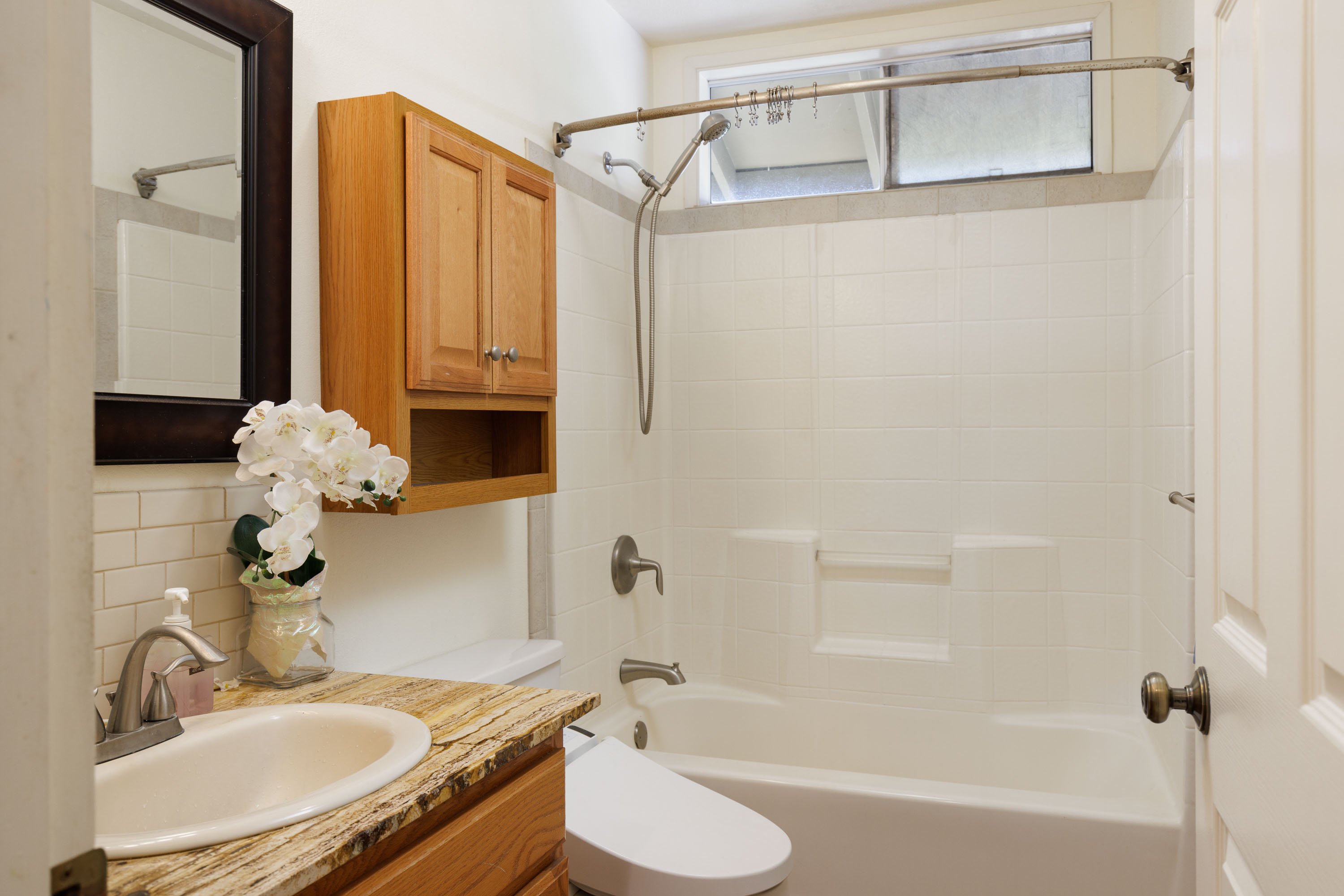 The kitchen boasts stainless steel appliances, extensive kitchen cabinets and an island topped with brown and white granite countertops. There are 2 bedrooms with a guest bathroom on one side and the primary bedroom with its ensuite bathroom (walk-in shower) on the other.