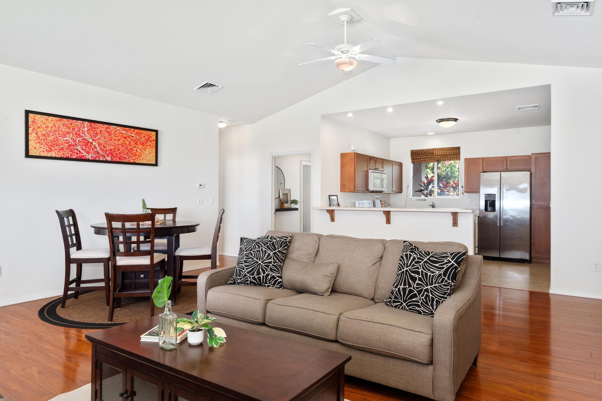 Nestled in the desirable Sunset Ridge neighborhood of Waikoloa Village, this beautifully designed single-level home offers gorgeous ocean and mountain views from its private cul-de-sac location. Situated on a 14,042-square-foot lot adjacent to open land owned by the Waikoloa Village Association, this 3-bedroom, 3-bathroom residence provides a peaceful retreat with unobstructed views and no neighboring homes between you and the ocean. With 1,701 square feet of living space, the home features an open floor plan encompassing the living, dining and kitchen spaces. Accented by vaulted ceilings the living area flows effortlessly onto the lānai, where you can take in the sunsets and endless ocean views. All three bedrooms are ensuite and two offer direct access to either the home’s lānai or backyard; the primary suite boasting a walk-in closet, double-sink vanity, and walk-in shower. A well-appointed kitchen, designed for both functionality and convenience, looks out to the ocean. The garage opens directly into the kitchen for easy unloading of shopping. Laminate flooring in the living room, central air conditioning, and 9-foot ceilings throughout ensure a comfortable climate year-round. The expansive front and back yards are a highlight, featuring mature, grafted mango, grapefruit, tangerine, orange trees, maintained by a drip irrigation system in the front, while the lush grassy backyard, on an automatic sprinkler system, provides the perfect space for outdoor games and relaxation. This home has been gently lived in as a second residence, meticulously maintained, and is fully furnished, making it move-in ready. Enjoy the serenity of Waikoloa Village living, just minutes away from the Village’s shopping centers and a short drive to the resorts and beaches of the sunny Kohala Coast.