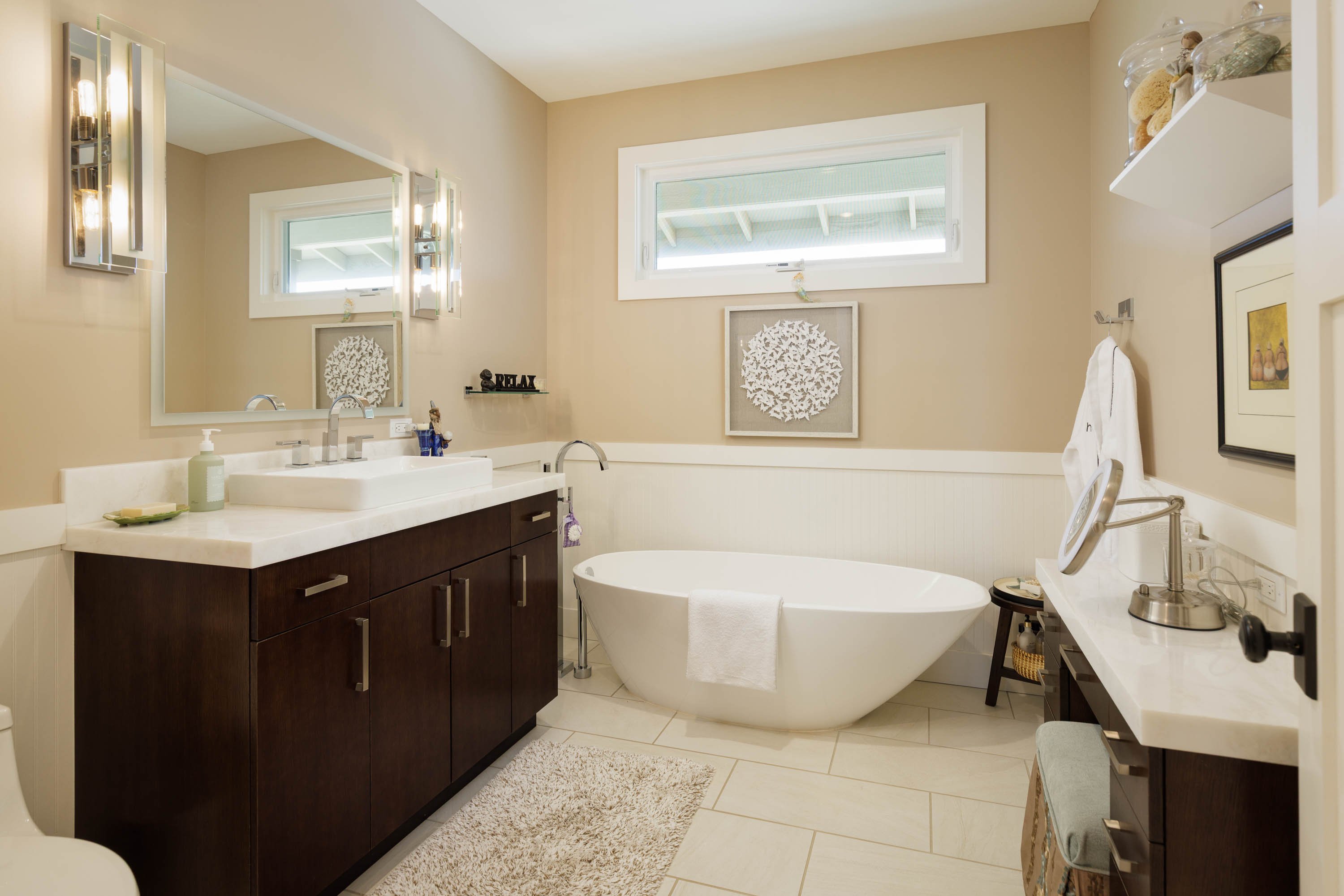 The primary suite is privately tucked away, offering lush tropical views and a luxurious ensuite with dual rectangular vessel sinks on a light-colored countertop & a spacious walk-in shower with 2 shower heads & exhaust fan. The 2 guest bedrooms are cozy & offering mountain views. The guest bathroom has a sophisticated & spa-like ambiance with a modern, freestanding oval soaking tub that is the centerpiece of the room. The rooms use calming neutral tones & the overall style of this property is tropical-modern with a balance of functionality & elegance. The detached 2-car garage with additional storage is situated in the back of the house. Thoughtfully designed & beautifully maintained, this home is move-in ready and a true island gem!