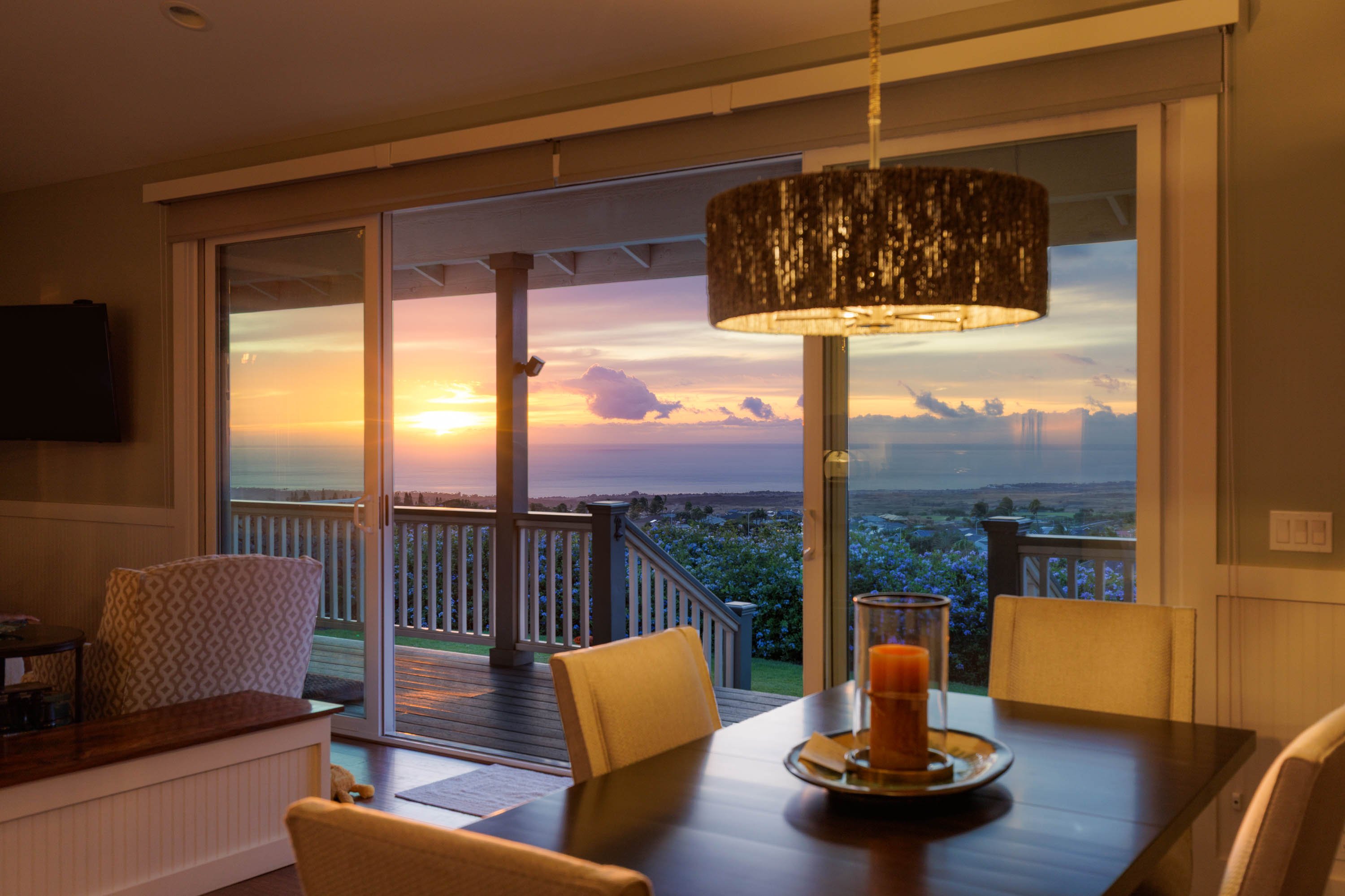 Enjoy the open concept living with vaulted ceilings and effortless flow between the kitchen, dining and living areas. The gourmet kitchen features stainless steel appliances, a spacious island, and sleek finishes. Smart owner upgrades like engineered hard wood flooring throughout & a quiet, efficient split AC system reflect the kind of quality & comfort you will truly appreciate. The glass door windows invite the outdoor into the home & give you access to the covered lanai made with Trex composite. The tranquil wrap around lanai offers stunning views & true indoor-outdoor living, perfect for enjoying morning sunrises, evening sunsets, and rainbows or ocean breezes all day. Experience the private garden shower which truly captures the essence of being in Hawaii. Walls of lava rock are used as privacy screening for the invigorating shower.
