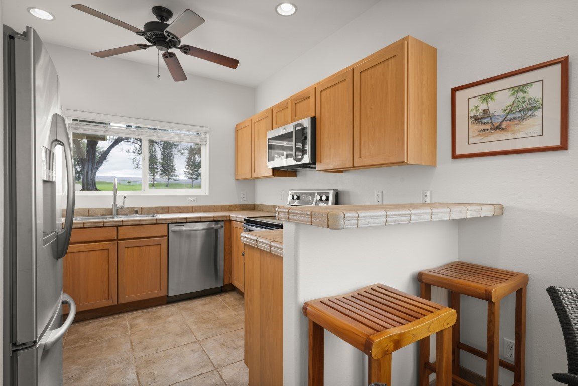 Rarely available 17th Fairway Villas, a gated community with only 27 detached condo homes fronting the Robert Trent Jones Jr. designed Waikoloa Village Golf Course. This is a lovely stand alone 3 bedroom , 2.5 bathroom condo with a 2 car garage and high vaulted ceilings! Primary bedroom and an ensuite bathroom are on the 1st level as well as a guest powder room. The kitchen boasts newer appliances and a range with double ovens. There is a separate laundry room downstairs. Upstairs is an extra loft area that could be used as and office or den, in addition to the 2 upstairs bedrooms and full bathroom. Ceiling fans are in every room. There is a spacious covered patio looking out onto the 17th fairway. This unit boast gorgeous views of the golf course and Mauna Kea, Mauna Loa and Hualalai Mountains and breathtaking sunrise views. Outside landscaping includes colorful hibiscus, as well as tasteful palms and ground cover. This unit is offered furnished.