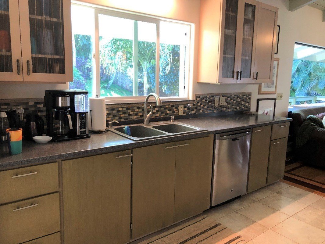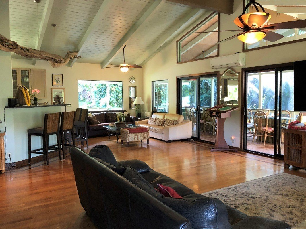 Large open living, dining, kitchen area with cathedral ceiling! Oak ,Brazilian and cherry floors and ceramic tile. Enjoy dining out on screened classy lanai. Master suite, 2nd bedroom, full bath, living rm, kitchen, breakfast area all on main floor. Spiral staircase to lower exposed level with large office, sitting room, 3rd,4th,5th bedrooms with shared full bat, with exit to covered carport. A few bonus rooms .Screened Pavillion with redwood ceiling for yoga or exercise rm. Orange, avacado, banana and mangos trees. 3 station water filtration system, Roof about 4-5 yrs old. 2-120 gal propane tanks. Outside shower, 2 additional sinks in bonus rms. Well and selected electrical circuits available for a mobile generator. 2 solar hot water panels on roof for 104 gal. fiberglass "Forever hot water storage tank. Propane on demand Rinnal water heater. New ductless mini-split air-conditioning both levels. Stainless steel cable railing. Moloaa Bay near by. Furniture negotiable.