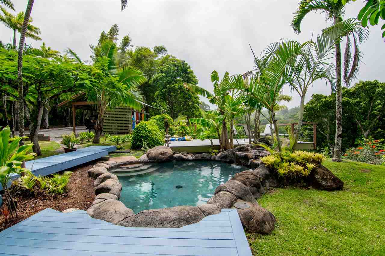 One of a kind tropical oasis, where East meets West. This is what happens when a gifted architect transforms an exclusive Balinese style home into a dream home! Whimsical. Tropical. Private with lush gardens and a salt water dipping pool. Ample decking to enjoy the outdoor beauty, with attention to every architectural detail. Well thought out and comfortable use of space adds style and dimension to make daily life extraordinary. This property is for people who thrive on the beauty of nature, and appreciate "out of the box" innovation. After sunset, the only man-made lights that you'll see are the ones you choose to turn on...now that's tranquility! Outside, breathe in the Botanical garden-like setting with a huge variety of plants, shrubs and trees, attracting colorful tropical birds. If you love the beauty of natural wood, you'll appreciate the assorted hardwoods used, which include Mahogany Entry Doors, Native Hawaii Ohia Floors, Koa Stairs, Whitewashed Birch Walls (book matched), Rare 12 Twisty Ohia Logs in Entry Hall, a Koa and Black Walnut Bar, Robusta Built-In Designer Bookshelves, as well as Koa and Monkeypod Circular Windows. Mahogany trimmed throughout. This is not a drive by, schedule your appointment with your favorite Realtor today.