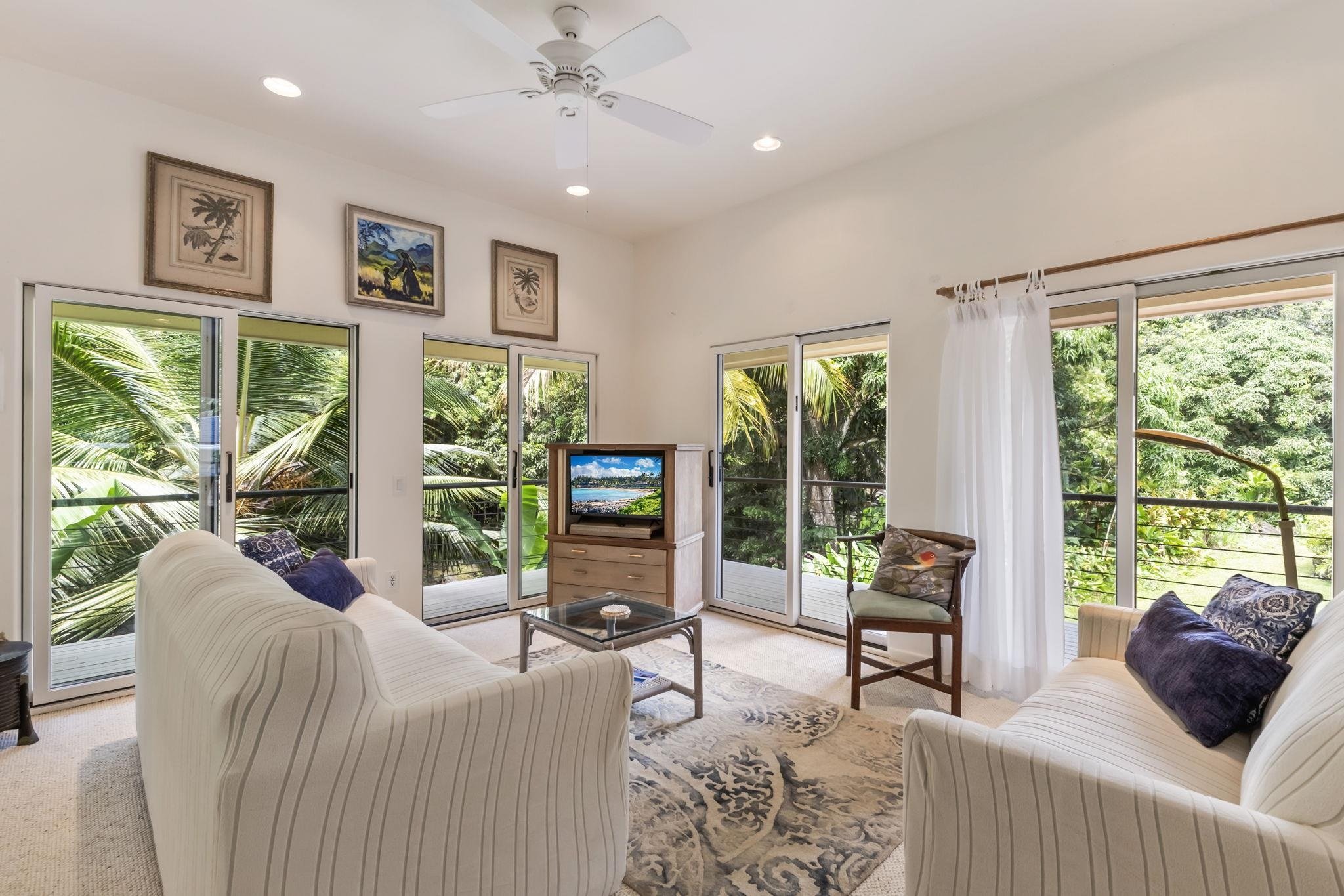 Welcome to Papalani - where the idyllic Hana coastline meets an artistic vision of multi-dwelling living. This tropical 1 acre estate along the Waiohonu stream and across from the Venus Pool offers a unique opportunity for shared ownership, rental income, or a private retreat. The property features 4 distinct living spaces, thoughtfully positioned for privacy and flexibility. The spacious main residence has multiple lanais, vaulted ceilings, and custom finishes. A grand covered entrance and curved staircase leads to the open living room and kitchen with abundant natural light and a primary suite with soaking tub, shower, bidet, and artist’s studio. Downstairs is an additional living area and bedroom, 1.5 baths, and 2 outdoor showers. Adjacent to the main house is a 2 bedroom guest suite with a screened kitchenette and lanais. The 1 bed 700sf ohana is well built with a full kitchen, bath, and laundry. At the front of the estate is the original 656sf restored cottage with open layout, tall ceilings, tile floors, and an indoor/outdoor soaking tub and shower. Located directly across from Waioka Pond (Venus Pool) and just 3 minutes from iconic Hamoa Beach, the property is close to Hana’s markets, cafes, & art galleries. Though the structures are solidly built, they reflect their age - offering a remarkable canvas for the visionary buyer to reimagine this estate in their own style.