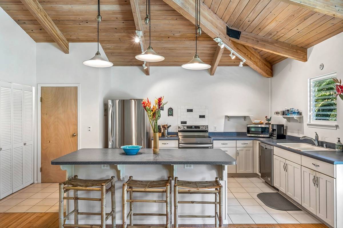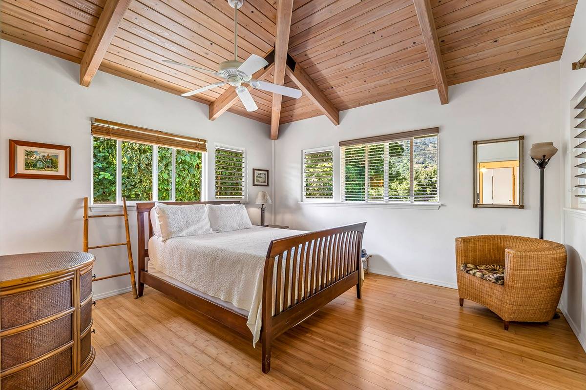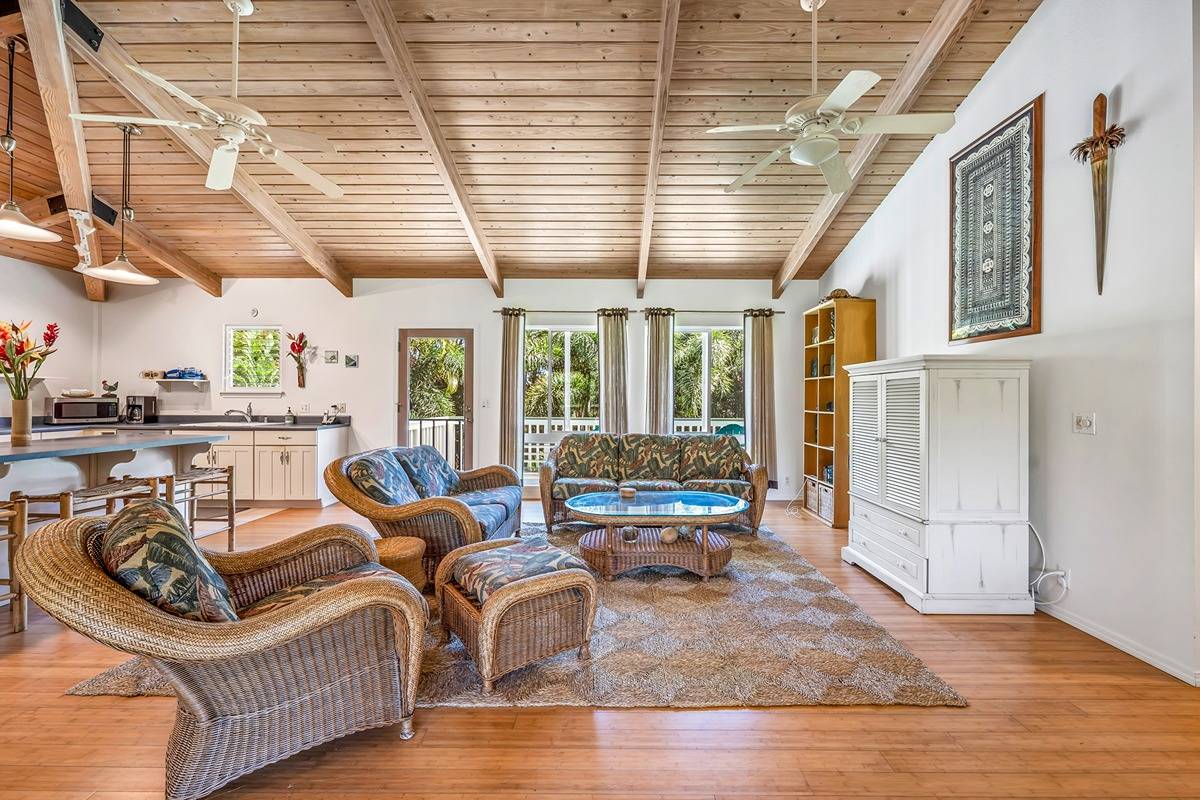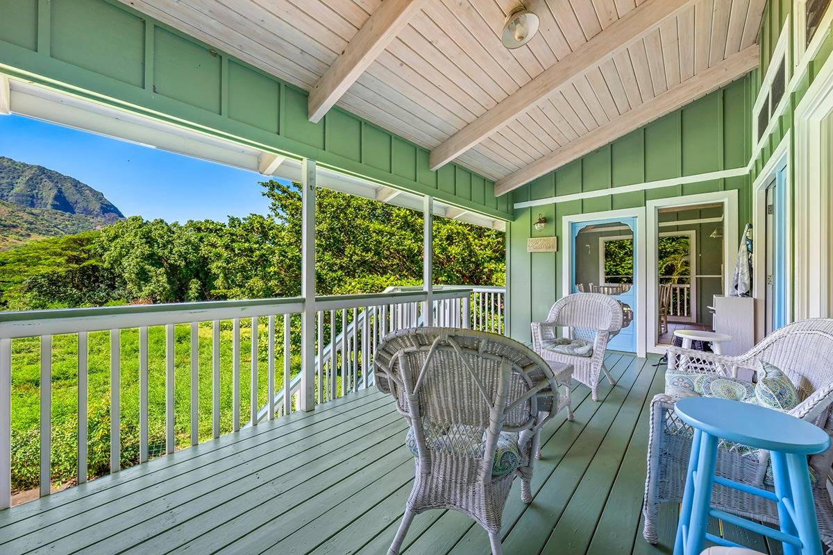 A rare Licensed Vacation rental is now available on the North Shore in Wainiha. Hale Oli provides a peaceful and tranquil setting and has been primarily used by the owners in the recent past with limited vacation rentals. You can spend hours on the lanai gazing and daydreaming with the spectacular vista's of the Haena mountains including Mount Makana. The home has been meticulously cared for during the 15 year tenure of the current owners. Just a short stroll to the many beaches nearby and 15 minutes from Hanalei Bay. The home is located away from the road. Palm trees were planted surrounding the property years ago to create a very private environment in nature. The sound of waves and cool breezes makes every day feel special. The owners say, "It is truly a gift to be able to enjoy the country setting and experience old Kauai."