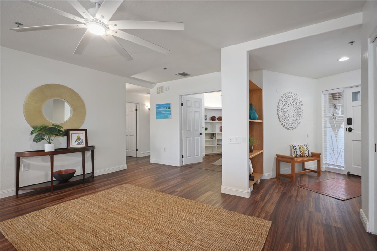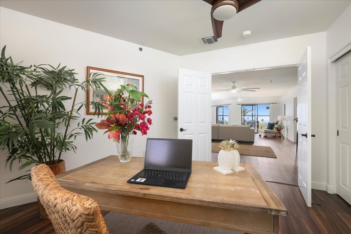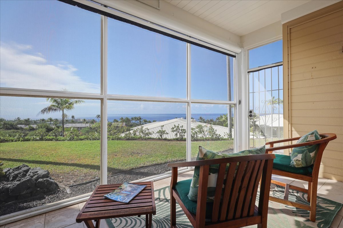 Kaulana at Keauhou, gated, high-end complex in one of the best locations in Kailua-Kona. Situated at a higher elevation to catch the mauka-makai ( mountain to ocean) breezes day and night! Stunning blue ocean water views. The original complex was to be much larger, so the amenities are designed with space in mind! Unit is tucked away from Kaluna Street with a shady tree and wonderful views! Well-designed parking is level and covered for owners. Elevators are easily accessible for all three floors of the building. Many safety and security features are built into the complex. This ground-floor, single-level unit has no stair thresholds, allowing for easy transition from room to room. Primary suite is separate from the other 2 bedrooms with a big ocean and coast line view. New LVP flooring throughout the home, with new kitchen and both bath rooms with new fixtures, counter tops, appliances and cabinets. This unit has the rare " Grandfathered in" screened in lanai with power shades for late afternoon enjoyment of the active coastline and water view with out the glare. Currently the 3rd bedroom is set up as a den/ guest overflow/ office but is certainly large enough to handle a full bedroom suite. Kaulana's management and amenities are among the best on the Kona Coast. The owner community is active in social and physical activities, tennis, pickleball, a huge swimming pool, a game room, a library, conference rooms, and social gathering areas. Easy access with elevators to all levels of the Club House. You are 5 minutes from KTA Super Store at Keauhou Shopping Center, 5 minutes from Keauhou Bay and 5 Minutes from Kaha`lu Snorkel Beach. Just 15 minutes from Kona Community Hospital. If you are looking for a full time home at a great price, or a second home near beaches at a great price.. this could be the one! Virtual tour attached!