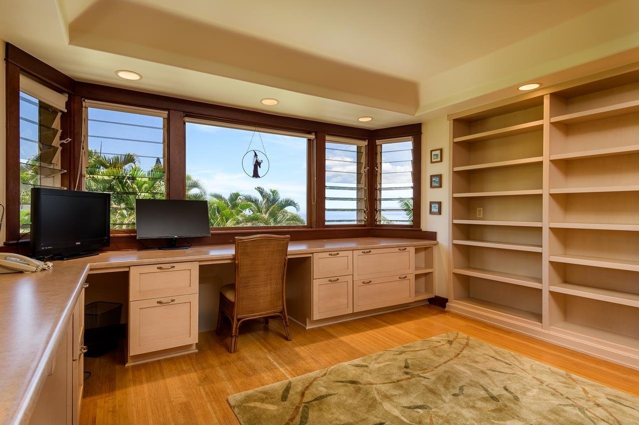 Perched at the top of the hill in Maui Meadows is this spectacular, classic, ocean and outer-island view residence. This gated, lushly landscaped spacious & private property additionally features a lower level guest/caretakers suite with its own covered lanai & private entrance, a serenely private saline pool & tropical garden area & a detached light-filled grand studio-space. This private oasis exudes a feeling of serenity; fully experienced while rocking gently, on the covered, wrap-around lanai, with it perimeter glass & Ipe wood railings, while gazing at Molokini Crater & the richly-hued red hills of Kaho’olawe. Arched wood, glass doors & room entrances, along with natural wood bamboo floors, set an elegant tone. The great room’s Fleetwood sliding glass walls retract, opening to the covered lanai area, invoke that classic Maui indoor/outdoor living experience. The center-island kitchen features KitchenAide appliances, including the 5 burner gas cook-top, gorgeous specimen granite counters & warm toned cherry & bamboo cabinetry. A large den/media room & a spacious guest bedroom with ensuite bath are on the ground floor. The ocean view master with en-suite bath enjoys access to its own private lanai. Lovely built-ins enhance the functionality of the two large office areas. The fully carpeted third floor may be just perfect as additional sleeping area or game/play room. This meticulously maintained residence has a 10 KW net metered solar array, 2 vehicle chargers, 2 Tesla Battery back-ups, a security system, 2 washer /dryers, central sound & intercom systems, sauna & poolside half-bath.