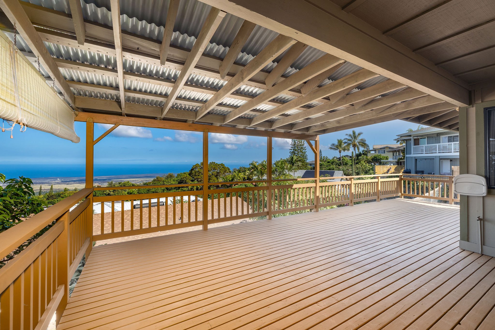 Spacious living and dining area, living room also opens onto large covered lanai area. Lanai area is expansive with great views. Perfect for entertaining, BBQing, and pau hana cocktails.